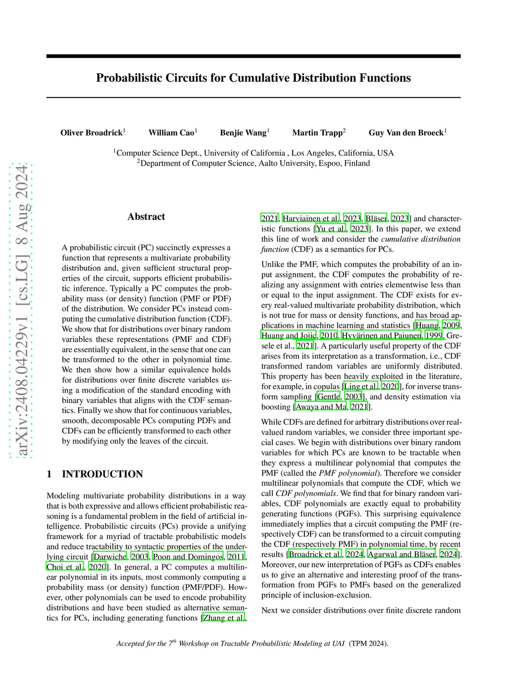 A probabilistic circuit (PC) succinctly expresses a function that represents a multivariate probability distribution and, given sufficient structural properties of the circuit, supports efficient probabilistic inference. Typically a PC computes the probability mass (or density) function (PMF or PDF) of the distribution. We consider PCs instead computing the cumulative distribution function (CDF). We show that for distributions over binary random variables these representations (PMF and CDF) are essentially equivalent, in the sense that one can be transformed to the other in polynomial time. We then show how a similar equivalence holds for distributions over finite discrete variables using a modification of the standard encoding with binary variables that aligns with the CDF semantics. Finally we show that for continuous variables, smooth, decomposable PCs computing PDFs and CDFs can be efficiently transformed to each other by modifying only the leaves of the circuit.