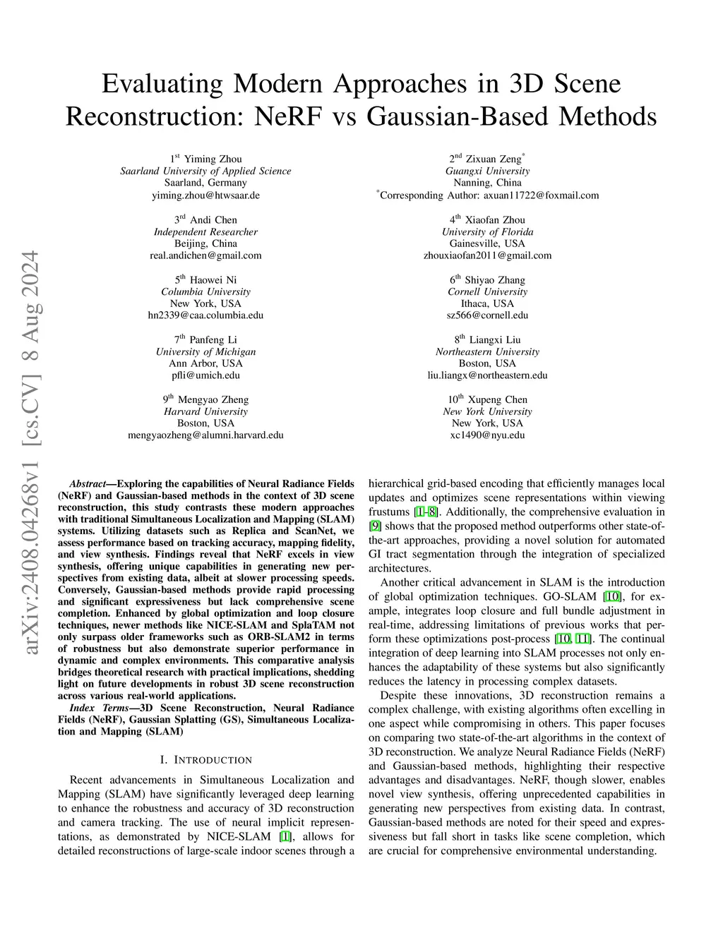 Exploring the capabilities of Neural Radiance Fields (NeRF) and Gaussian-based methods in the context of 3D scene reconstruction, this study contrasts these modern approaches with traditional Simultaneous Localization and Mapping (SLAM) systems. Utilizing datasets such as Replica and ScanNet, we assess performance based on tracking accuracy, mapping fidelity, and view synthesis. Findings reveal that NeRF excels in view synthesis, offering unique capabilities in generating new perspectives from existing data, albeit at slower processing speeds. Conversely, Gaussian-based methods provide rapid processing and significant expressiveness but lack comprehensive scene completion. Enhanced by global optimization and loop closure techniques, newer methods like NICE-SLAM and SplaTAM not only surpass older frameworks such as ORB-SLAM2 in terms of robustness but also demonstrate superior performance in dynamic and complex environments. This comparative analysis bridges theoretical research with practical implications, shedding light on future developments in robust 3D scene reconstruction across various real-world applications.