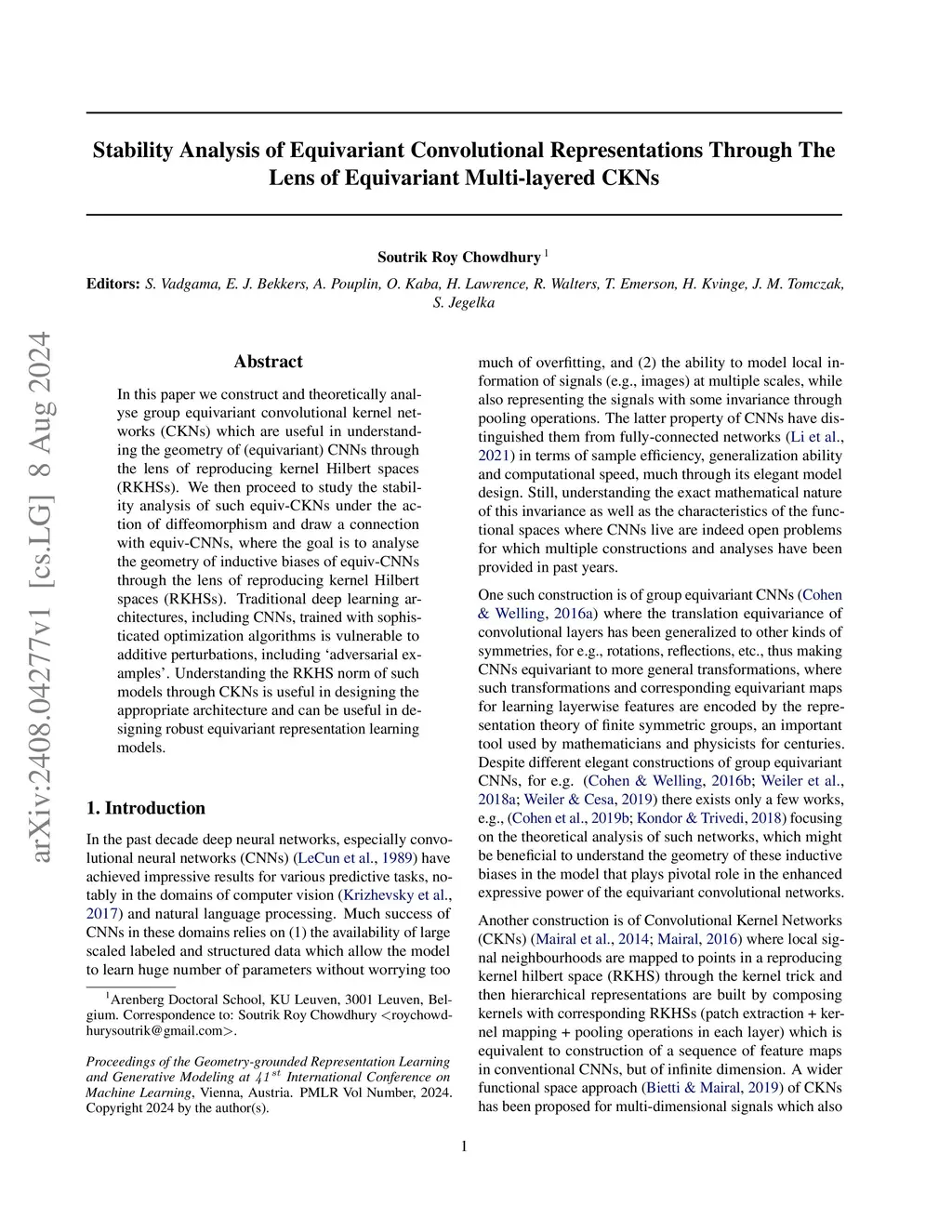 In this paper we construct and theoretically analyse group equivariant convolutional kernel networks (CKNs) which are useful in understanding the geometry of (equivariant) CNNs through the lens of reproducing kernel Hilbert spaces (RKHSs). We then proceed to study the stability analysis of such equiv-CKNs under the action of diffeomorphism and draw a connection with equiv-CNNs, where the goal is to analyse the geometry of inductive biases of equiv-CNNs through the lens of reproducing kernel Hilbert spaces (RKHSs). Traditional deep learning architectures, including CNNs, trained with sophisticated optimization algorithms is vulnerable to perturbations, including `adversarial examples'. Understanding the RKHS norm of such models through CKNs is useful in designing the appropriate architecture and can be useful in designing robust equivariant representation learning models.