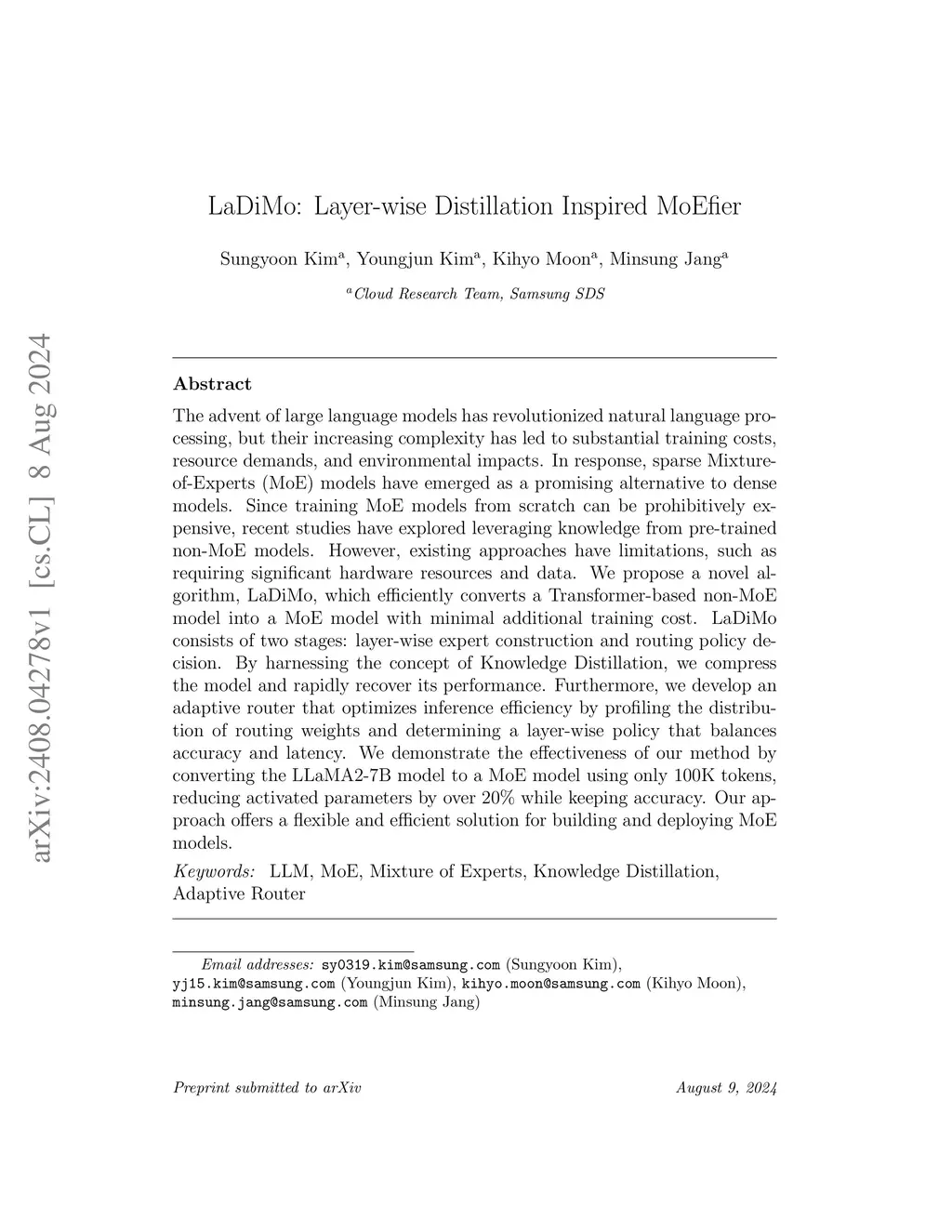 The advent of large language models has revolutionized natural language processing, but their increasing complexity has led to substantial training costs, resource demands, and environmental impacts. In response, sparse Mixture-of-Experts (MoE) models have emerged as a promising alternative to dense models. Since training MoE models from scratch can be prohibitively expensive, recent studies have explored leveraging knowledge from pre-trained non-MoE models. However, existing approaches have limitations, such as requiring significant hardware resources and data. We propose a novel algorithm, LaDiMo, which efficiently converts a Transformer-based non-MoE model into a MoE model with minimal additional training cost. LaDiMo consists of two stages: layer-wise expert construction and routing policy decision. By harnessing the concept of Knowledge Distillation, we compress the model and rapidly recover its performance. Furthermore, we develop an adaptive router that optimizes inference efficiency by profiling the distribution of routing weights and determining a layer-wise policy that balances accuracy and latency. We demonstrate the effectiveness of our method by converting the LLaMA2-7B model to a MoE model using only 100K tokens, reducing activated parameters by over 20% while keeping accuracy. Our approach offers a flexible and efficient solution for building and deploying MoE models.