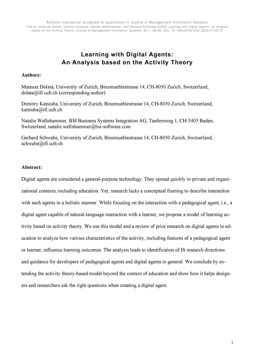 Learning with Digital Agents: An Analysis based on the Activity Theory