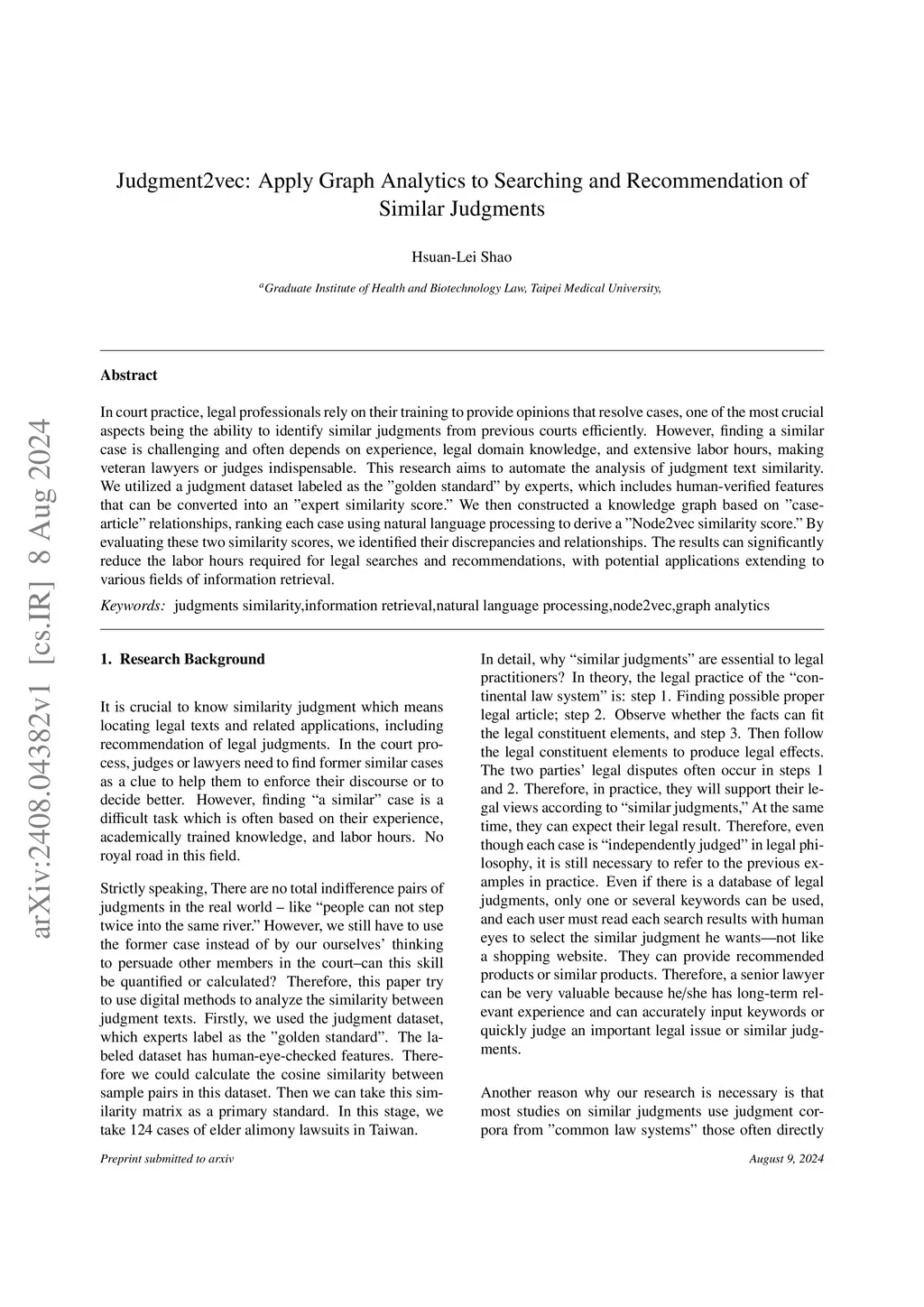 In court practice, legal professionals rely on their training to provide opinions that resolve cases, one of the most crucial aspects being the ability to identify similar judgments from previous courts efficiently. However, finding a similar case is challenging and often depends on experience, legal domain knowledge, and extensive labor hours, making veteran lawyers or judges indispensable. This research aims to automate the analysis of judgment text similarity. We utilized a judgment dataset labeled as the "golden standard" by experts, which includes human-verified features that can be converted into an "expert similarity score." We then constructed a knowledge graph based on "case-article" relationships, ranking each case using natural language processing to derive a "Node2vec similarity score." By evaluating these two similarity scores, we identified their discrepancies and relationships. The results can significantly reduce the labor hours required for legal searches and recommendations, with potential applications extending to various fields of information retrieval.