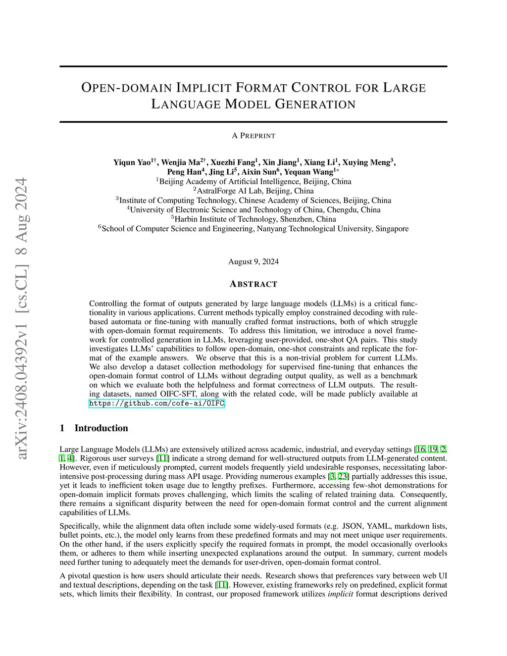 Controlling the format of outputs generated by large language models (LLMs) is a critical functionality in various applications. Current methods typically employ constrained decoding with rule-based automata or fine-tuning with manually crafted format instructions, both of which struggle with open-domain format requirements. To address this limitation, we introduce a novel framework for controlled generation in LLMs, leveraging user-provided, one-shot QA pairs. This study investigates LLMs' capabilities to follow open-domain, one-shot constraints and replicate the format of the example answers. We observe that this is a non-trivial problem for current LLMs. We also develop a dataset collection methodology for supervised fine-tuning that enhances the open-domain format control of LLMs without degrading output quality, as well as a benchmark on which we evaluate both the helpfulness and format correctness of LLM outputs. The resulting datasets, named OIFC-SFT, along with the related code, will be made publicly available at https://github.com/cofe-ai/OIFC.