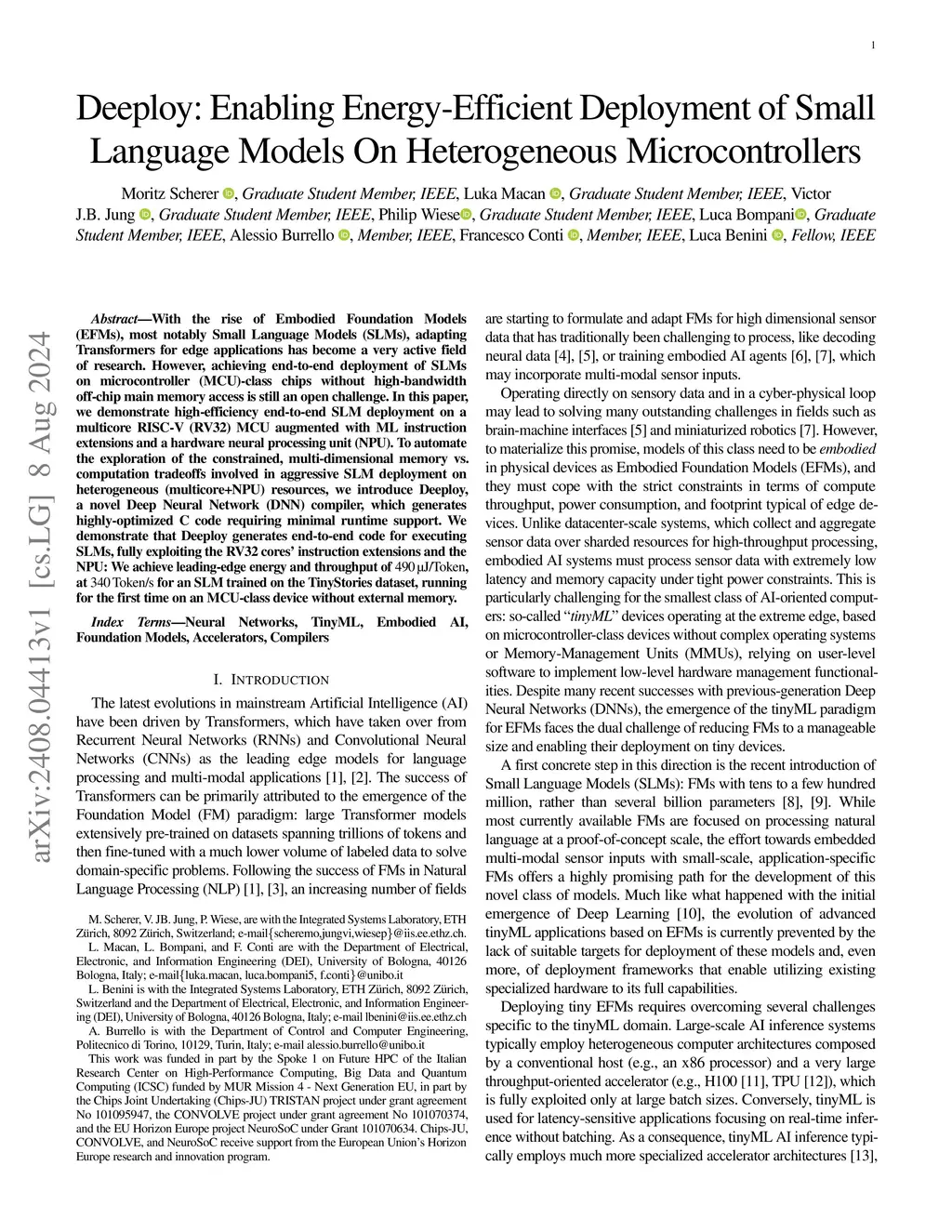 With the rise of Embodied Foundation Models (EFMs), most notably Small Language Models (SLMs), adapting Transformers for edge applications has become a very active field of research. However, achieving end-to-end deployment of SLMs on microcontroller (MCU)-class chips without high-bandwidth off-chip main memory access is still an open challenge. In this paper, we demonstrate high-efficiency end-to-end SLM deployment on a multicore RISC-V (RV32) MCU augmented with ML instruction extensions and a hardware neural processing unit (NPU). To automate the exploration of the constrained, multi-dimensional memory vs. computation tradeoffs involved in aggressive SLM deployment on heterogeneous (multicore+NPU) resources, we introduce Deeploy, a novel Deep Neural Network (DNN) compiler, which generates highly-optimized C code requiring minimal runtime support. We demonstrate that Deeploy generates end-to-end code for executing SLMs, fully exploiting the RV32 cores' instruction extensions and the NPU: We achieve leading-edge energy and throughput of \SI{490}{\micro\joule \per Token}, at \SI{340}{Token \per \second} for an SLM trained on the TinyStories dataset, running for the first time on an MCU-class device without external memory.