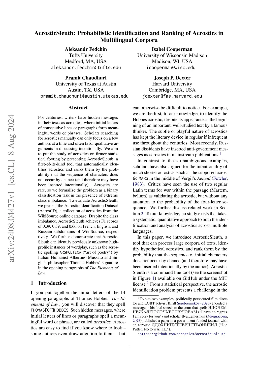 For centuries, writers have hidden messages in their texts as acrostics, where initial letters of consecutive lines or paragraphs form meaningful words or phrases. Scholars searching for acrostics manually can only focus on a few authors at a time and often favor qualitative arguments in discussing intentionally. We aim to put the study of acrostics on firmer statistical footing by presenting AcrosticSleuth, a first-of-its-kind tool that automatically identifies acrostics and ranks them by the probability that the sequence of characters does not occur by chance (and therefore may have been inserted intentionally). Acrostics are rare, so we formalize the problem as a binary classification task in the presence of extreme class imbalance. To evaluate AcrosticSleuth, we present the Acrostic Identification Dataset (AcrostID), a collection of acrostics from the WikiSource online database. Despite the class imbalance, AcrosticSleuth achieves F1 scores of 0.39, 0.59, and 0.66 on French, English, and Russian subdomains of WikiSource, respectively. We further demonstrate that AcrosticSleuth can identify previously unknown high-profile instances of wordplay, such as the acrostic spelling ARSPOETICA (``art of poetry") by Italian Humanist Albertino Mussato and English philosopher Thomas Hobbes' signature in the opening paragraphs of The Elements of Law.