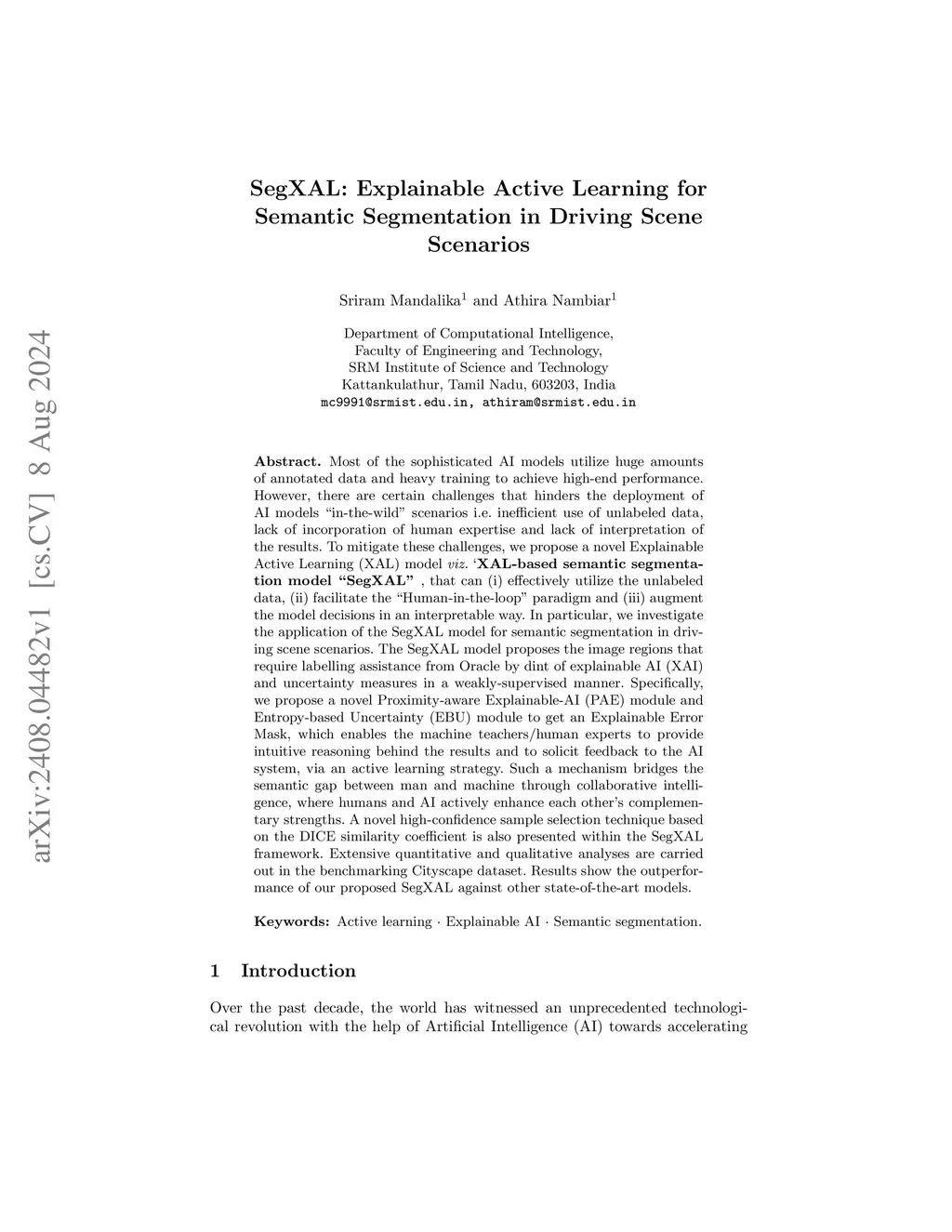 Most of the sophisticated AI models utilize huge amounts of annotated data and heavy training to achieve high-end performance. However, there are certain challenges that hinder the deployment of AI models "in-the-wild" scenarios, i.e., inefficient use of unlabeled data, lack of incorporation of human expertise, and lack of interpretation of the results. To mitigate these challenges, we propose a novel Explainable Active Learning (XAL) model, XAL-based semantic segmentation model "SegXAL", that can (i) effectively utilize the unlabeled data, (ii) facilitate the "Human-in-the-loop" paradigm, and (iii) augment the model decisions in an interpretable way. In particular, we investigate the application of the SegXAL model for semantic segmentation in driving scene scenarios. The SegXAL model proposes the image regions that require labeling assistance from Oracle by dint of explainable AI (XAI) and uncertainty measures in a weakly-supervised manner. Specifically, we propose a novel Proximity-aware Explainable-AI (PAE) module and Entropy-based Uncertainty (EBU) module to get an Explainable Error Mask, which enables the machine teachers/human experts to provide intuitive reasoning behind the results and to solicit feedback to the AI system via an active learning strategy. Such a mechanism bridges the semantic gap between man and machine through collaborative intelligence, where humans and AI actively enhance each other's complementary strengths. A novel high-confidence sample selection technique based on the DICE similarity coefficient is also presented within the SegXAL framework. Extensive quantitative and qualitative analyses are carried out in the benchmarking Cityscape dataset. Results show the outperformance of our proposed SegXAL against other state-of-the-art models.