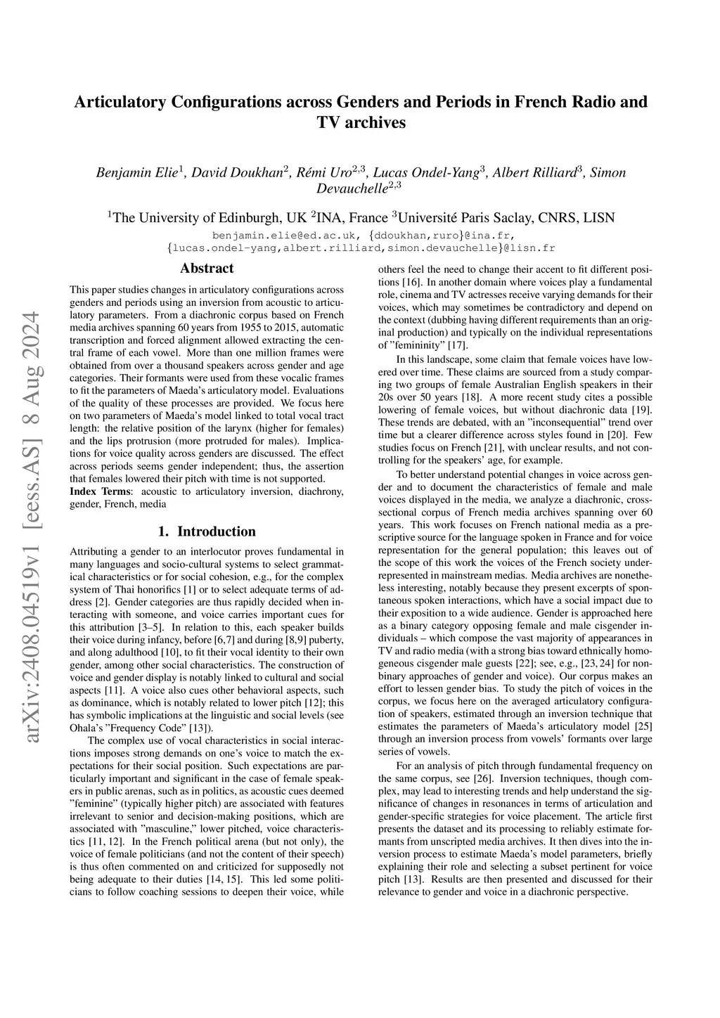 This paper studies changes in articulatory configurations across genders and periods using an inversion from acoustic to articulatory parameters. From a diachronic corpus based on French media archives spanning 60 years from 1955 to 2015, automatic transcription and forced alignment allowed extracting the central frame of each vowel. More than one million frames were obtained from over a thousand speakers across gender and age categories. Their formants were used from these vocalic frames to fit the parameters of Maeda's articulatory model. Evaluations of the quality of these processes are provided. We focus here on two parameters of Maeda's model linked to total vocal tract length: the relative position of the larynx (higher for females) and the lips protrusion (more protruded for males). Implications for voice quality across genders are discussed. The effect across periods seems gender independent; thus, the assertion that females lowered their pitch with time is not supported.
