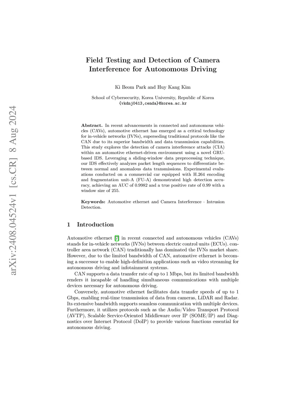 In recent advancements in connected and autonomous vehicles (CAVs), automotive ethernet has emerged as a critical technology for in-vehicle networks (IVNs), superseding traditional protocols like the CAN due to its superior bandwidth and data transmission capabilities. This study explores the detection of camera interference attacks (CIA) within an automotive ethernet-driven environment using a novel GRU-based IDS. Leveraging a sliding-window data preprocessing technique, our IDS effectively analyzes packet length sequences to differentiate between normal and anomalous data transmissions. Experimental evaluations conducted on a commercial car equipped with H.264 encoding and fragmentation unit-A (FU-A) demonstrated high detection accuracy, achieving an AUC of 0.9982 and a true positive rate of 0.99 with a window size of 255.