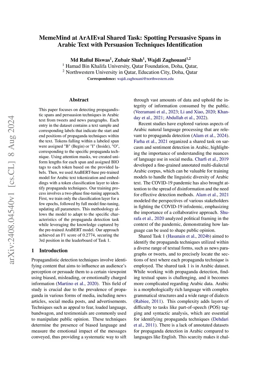 This paper focuses on detecting propagandistic spans and persuasion techniques in Arabic text from tweets and news paragraphs. Each entry in the dataset contains a text sample and corresponding labels that indicate the start and end positions of propaganda techniques within the text. Tokens falling within a labeled span were assigned "B" (Begin) or "I" (Inside), "O", corresponding to the specific propaganda technique. Using attention masks, we created uniform lengths for each span and assigned BIO tags to each token based on the provided labels. Then, we used AraBERT-base pre-trained model for Arabic text tokenization and embeddings with a token classification layer to identify propaganda techniques. Our training process involves a two-phase fine-tuning approach. First, we train only the classification layer for a few epochs, followed by full model fine-tuning, updating all parameters. This methodology allows the model to adapt to the specific characteristics of the propaganda detection task while leveraging the knowledge captured by the pre-trained AraBERT model. Our approach achieved an F1 score of 0.2774, securing the 3rd position in the leaderboard of Task 1.
