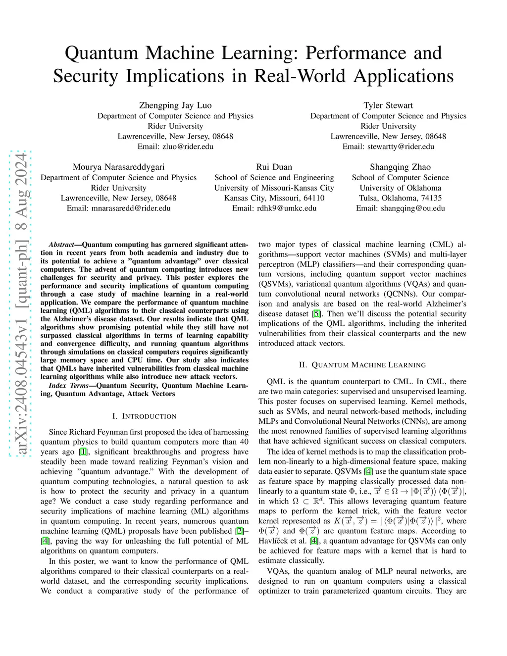 Quantum computing has garnered significant attention in recent years from both academia and industry due to its potential to achieve a "quantum advantage" over classical computers. The advent of quantum computing introduces new challenges for security and privacy. This poster explores the performance and security implications of quantum computing through a case study of machine learning in a real-world application. We compare the performance of quantum machine learning (QML) algorithms to their classical counterparts using the Alzheimer's disease dataset. Our results indicate that QML algorithms show promising potential while they still have not surpassed classical algorithms in terms of learning capability and convergence difficulty, and running quantum algorithms through simulations on classical computers requires significantly large memory space and CPU time. Our study also indicates that QMLs have inherited vulnerabilities from classical machine learning algorithms while also introduce new attack vectors.