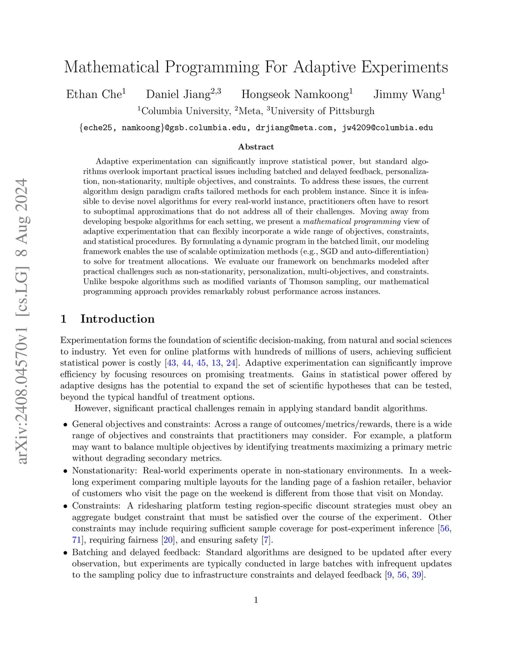 Adaptive experimentation can significantly improve statistical power, but standard algorithms overlook important practical issues including batched and delayed feedback, personalization, non-stationarity, multiple objectives, and constraints. To address these issues, the current algorithm design paradigm crafts tailored methods for each problem instance. Since it is infeasible to devise novel algorithms for every real-world instance, practitioners often have to resort to suboptimal approximations that do not address all of their challenges. Moving away from developing bespoke algorithms for each setting, we present a mathematical programming view of adaptive experimentation that can flexibly incorporate a wide range of objectives, constraints, and statistical procedures. By formulating a dynamic program in the batched limit, our modeling framework enables the use of scalable optimization methods (e.g., SGD and auto-differentiation) to solve for treatment allocations. We evaluate our framework on benchmarks modeled after practical challenges such as non-stationarity, personalization, multi-objectives, and constraints. Unlike bespoke algorithms such as modified variants of Thomson sampling, our mathematical programming approach provides remarkably robust performance across instances.
