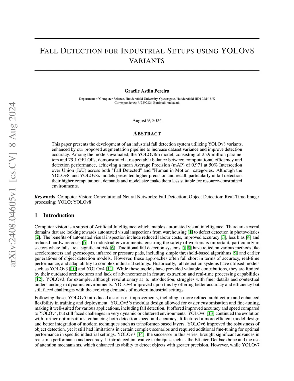 This paper presents the development of an industrial fall detection system utilizing YOLOv8 variants, enhanced by our proposed augmentation pipeline to increase dataset variance and improve detection accuracy. Among the models evaluated, the YOLOv8m model, consisting of 25.9 million parameters and 79.1 GFLOPs, demonstrated a respectable balance between computational efficiency and detection performance, achieving a mean Average Precision (mAP) of 0.971 at 50% Intersection over Union (IoU) across both "Fall Detected" and "Human in Motion" categories. Although the YOLOv8l and YOLOv8x models presented higher precision and recall, particularly in fall detection, their higher computational demands and model size make them less suitable for resource-constrained environments.