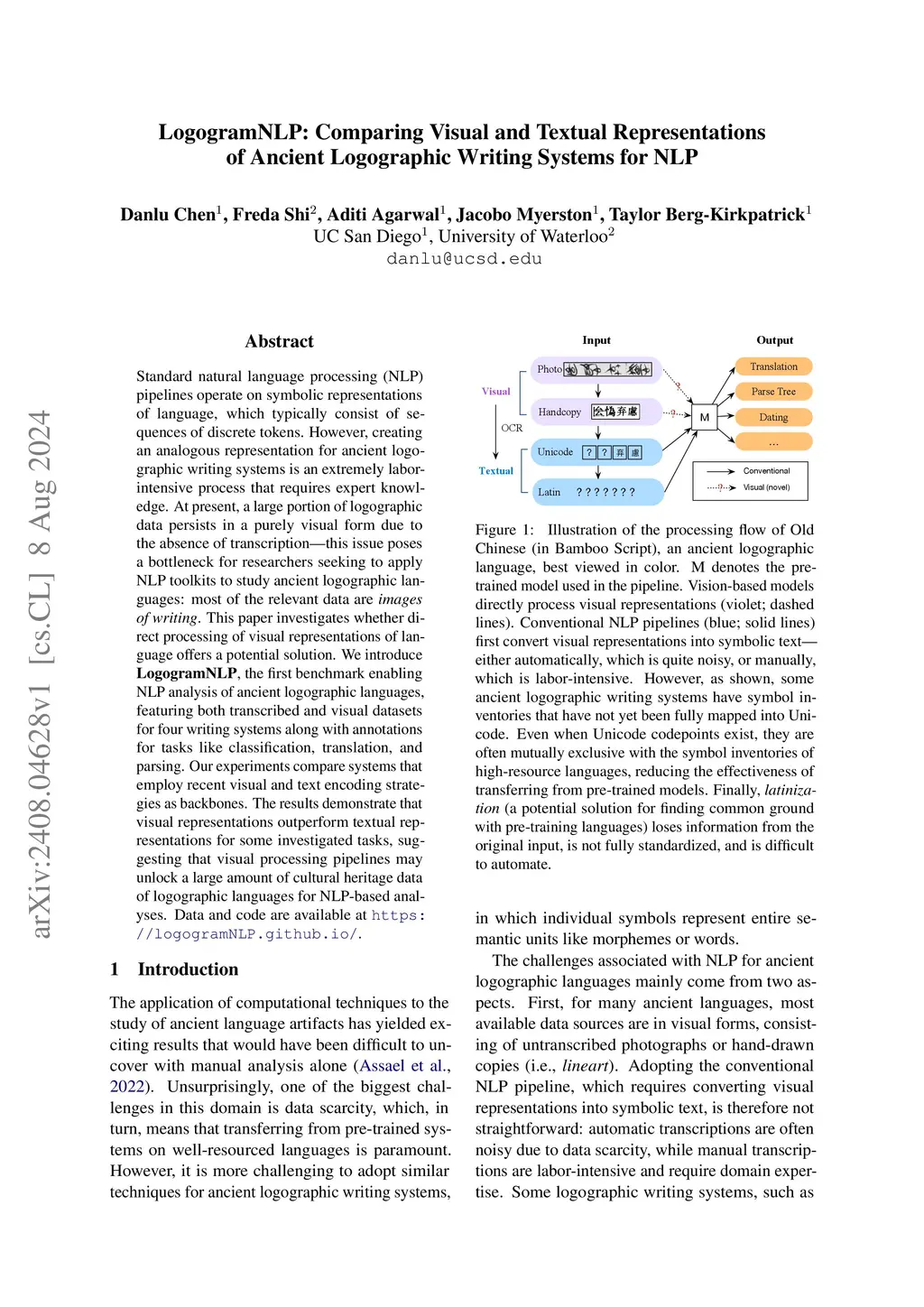 LogogramNLP: Comparing Visual and Textual Representations of Ancient Logographic Writing Systems for NLP