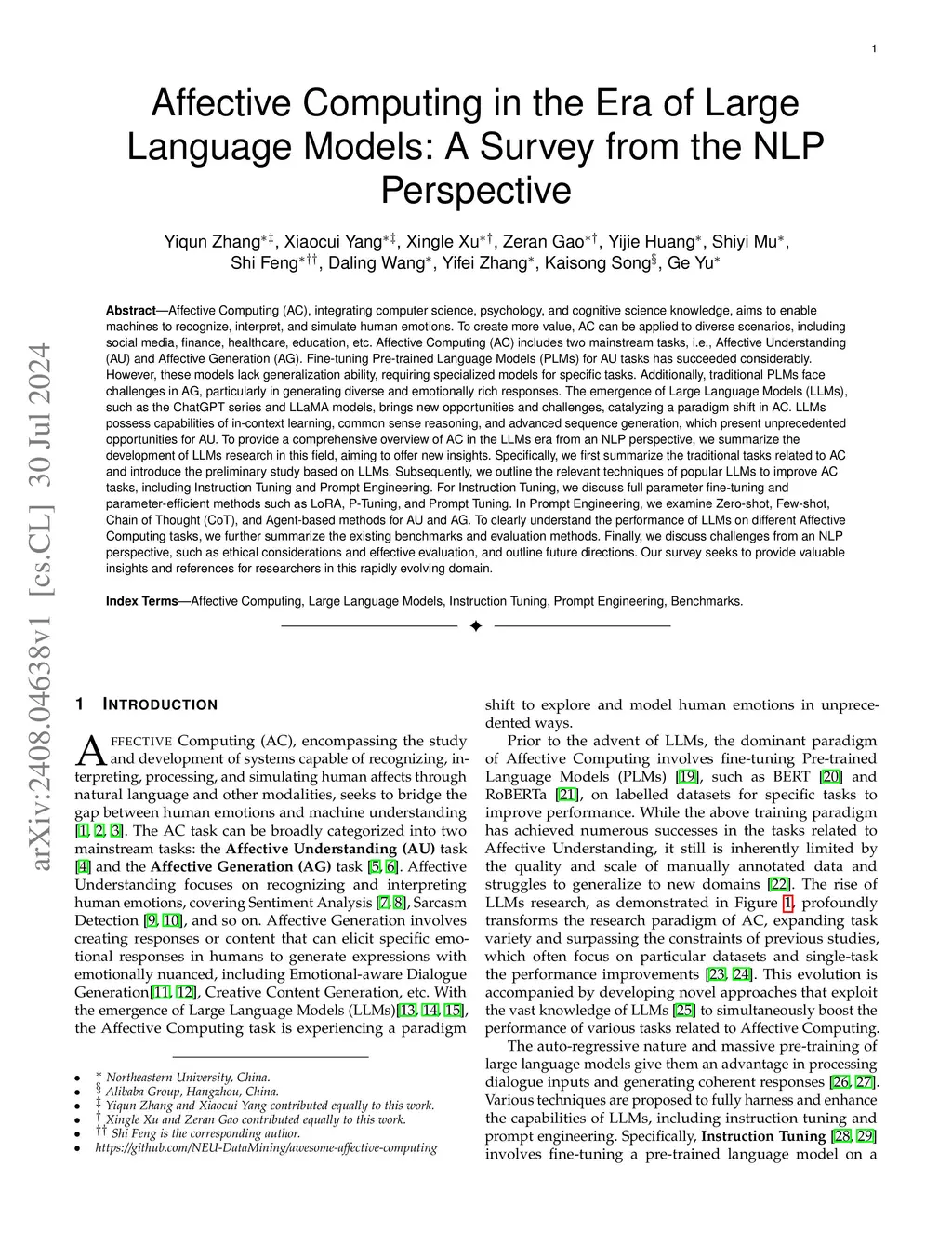 Affective Computing (AC) integrates computer science, psychology, and cognitive science to enable machines to recognize, interpret, and simulate human emotions across domains such as social media, finance, healthcare, and education. AC commonly centers on two task families: Affective Understanding (AU) and Affective Generation (AG). While fine-tuned pre-trained language models (PLMs) have achieved solid AU performance, they often generalize poorly across tasks and remain limited for AG, especially in producing diverse, emotionally appropriate responses. The advent of Large Language Models (LLMs) (e.g., ChatGPT and LLaMA) has catalyzed a paradigm shift by offering in-context learning, broader world knowledge, and stronger sequence generation. This survey presents an NLP-oriented overview of AC in the LLM era. We (i) consolidate traditional AC tasks and preliminary LLM-based studies; (ii) review adaptation techniques that improve AU/AG, including Instruction Tuning (full and parameter-efficient methods such as LoRA, P-/Prompt-Tuning), Prompt Engineering (zero/few-shot, chain-of-thought, agent-based prompting), and Reinforcement Learning. For the latter, we summarize RL from human preferences (RLHF), verifiable/programmatic rewards (RLVR), and AI feedback (RLAIF), which provide preference- or rule-grounded optimization signals that can help steer AU/AG toward empathy, safety, and planning, achieving finer-grained or multi-objective control. To assess progress, we compile benchmarks and evaluation practices for both AU and AG. We also discuss open challenges-from ethics, data quality, and safety to robust evaluation and resource efficiency-and outline research directions. We hope this survey clarifies the landscape and offers practical guidance for building affect-aware, reliable, and responsible LLM systems.