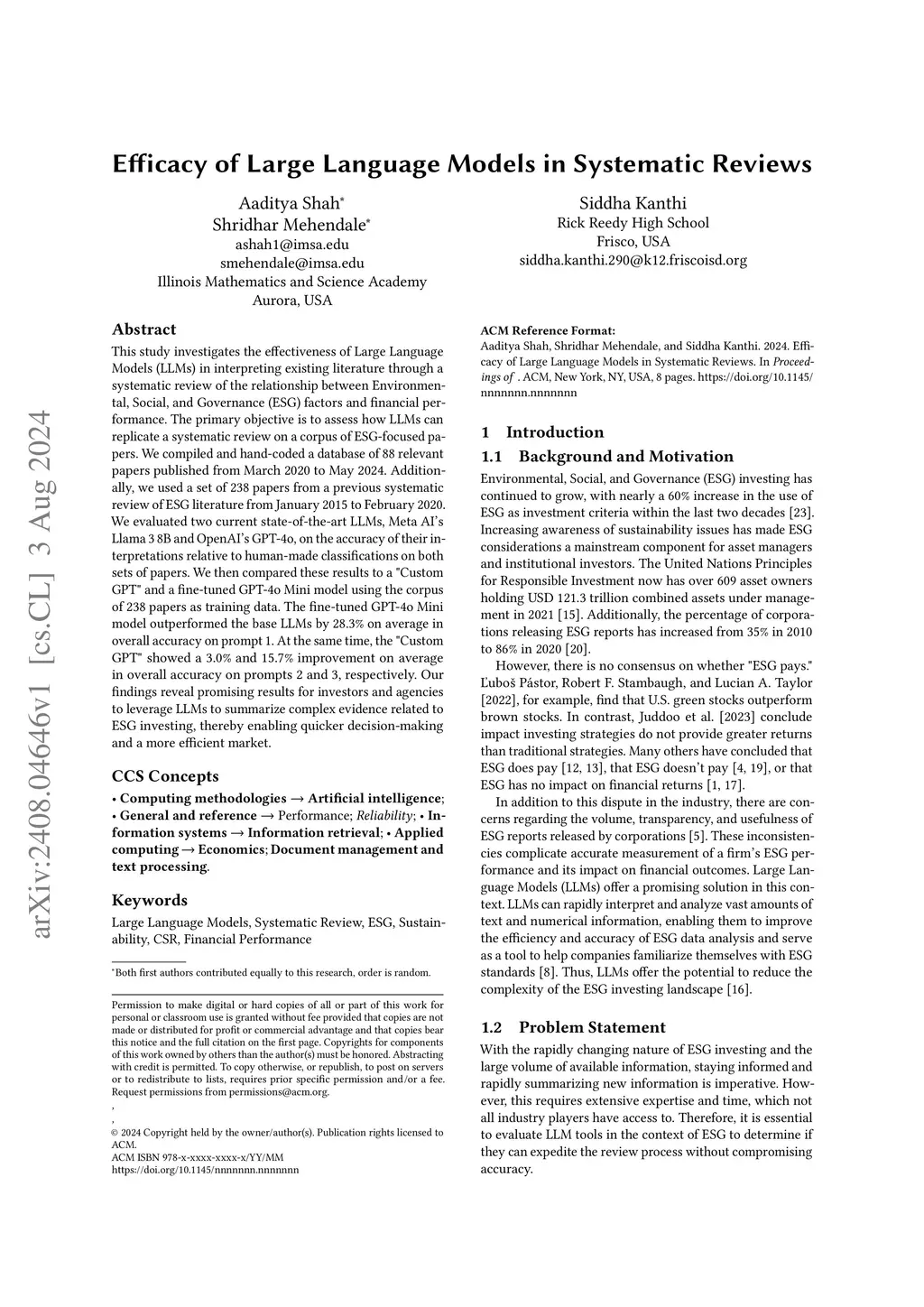 This study investigates the effectiveness of Large Language Models (LLMs) in interpreting existing literature through a systematic review of the relationship between Environmental, Social, and Governance (ESG) factors and financial performance. The primary objective is to assess how LLMs can replicate a systematic review on a corpus of ESG-focused papers. We compiled and hand-coded a database of 88 relevant papers published from March 2020 to May 2024. Additionally, we used a set of 238 papers from a previous systematic review of ESG literature from January 2015 to February 2020. We evaluated two current state-of-the-art LLMs, Meta AI's Llama 3 8B and OpenAI's GPT-4o, on the accuracy of their interpretations relative to human-made classifications on both sets of papers. We then compared these results to a "Custom GPT" and a fine-tuned GPT-4o Mini model using the corpus of 238 papers as training data. The fine-tuned GPT-4o Mini model outperformed the base LLMs by 28.3% on average in overall accuracy on prompt 1. At the same time, the "Custom GPT" showed a 3.0% and 15.7% improvement on average in overall accuracy on prompts 2 and 3, respectively. Our findings reveal promising results for investors and agencies to leverage LLMs to summarize complex evidence related to ESG investing, thereby enabling quicker decision-making and a more efficient market.