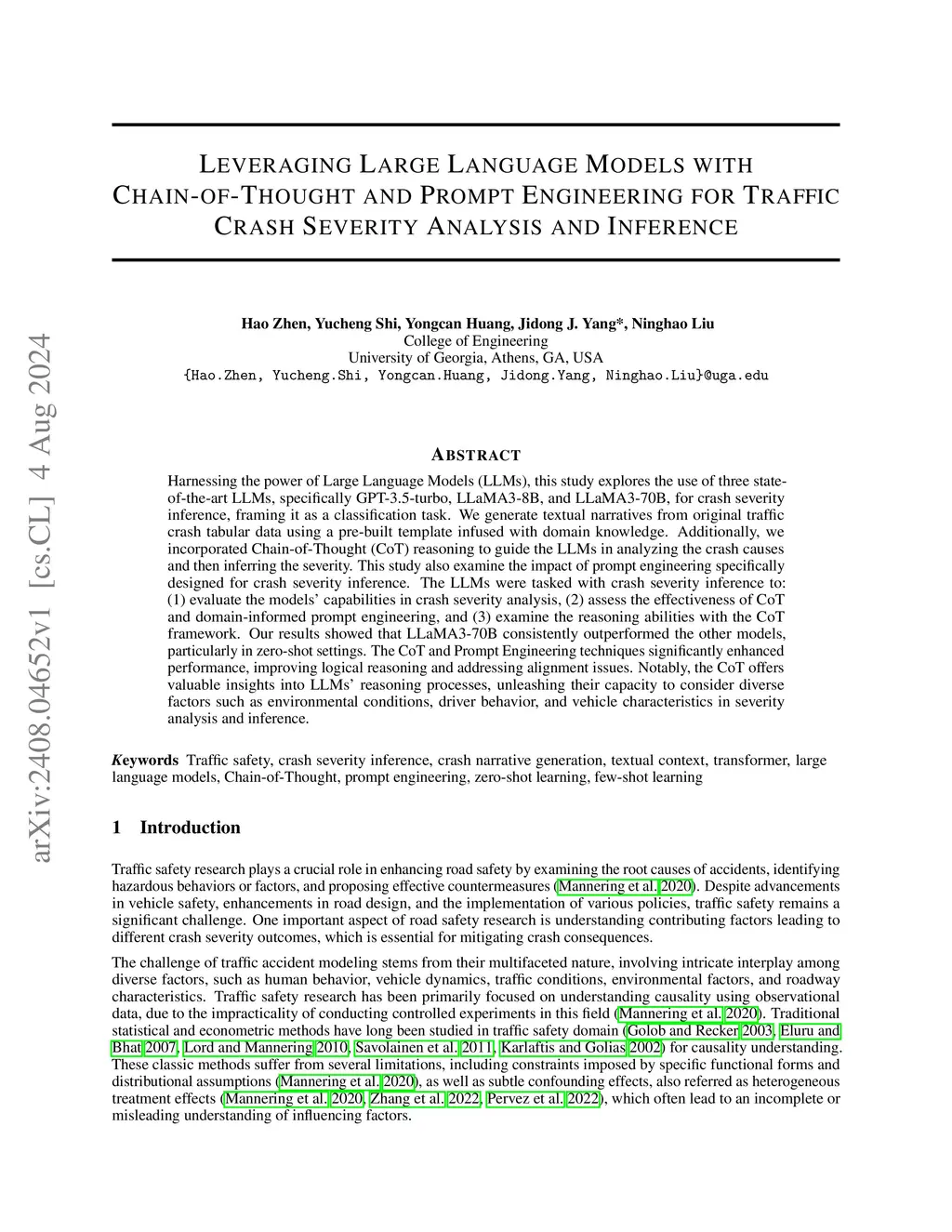 Harnessing the power of Large Language Models (LLMs), this study explores the use of three state-of-the-art LLMs, specifically GPT-3.5-turbo, LLaMA3-8B, and LLaMA3-70B, for crash severity inference, framing it as a classification task. We generate textual narratives from original traffic crash tabular data using a pre-built template infused with domain knowledge. Additionally, we incorporated Chain-of-Thought (CoT) reasoning to guide the LLMs in analyzing the crash causes and then inferring the severity. This study also examine the impact of prompt engineering specifically designed for crash severity inference. The LLMs were tasked with crash severity inference to: (1) evaluate the models' capabilities in crash severity analysis, (2) assess the effectiveness of CoT and domain-informed prompt engineering, and (3) examine the reasoning abilities with the CoT framework. Our results showed that LLaMA3-70B consistently outperformed the other models, particularly in zero-shot settings. The CoT and Prompt Engineering techniques significantly enhanced performance, improving logical reasoning and addressing alignment issues. Notably, the CoT offers valuable insights into LLMs' reasoning processes, unleashing their capacity to consider diverse factors such as environmental conditions, driver behavior, and vehicle characteristics in severity analysis and inference.