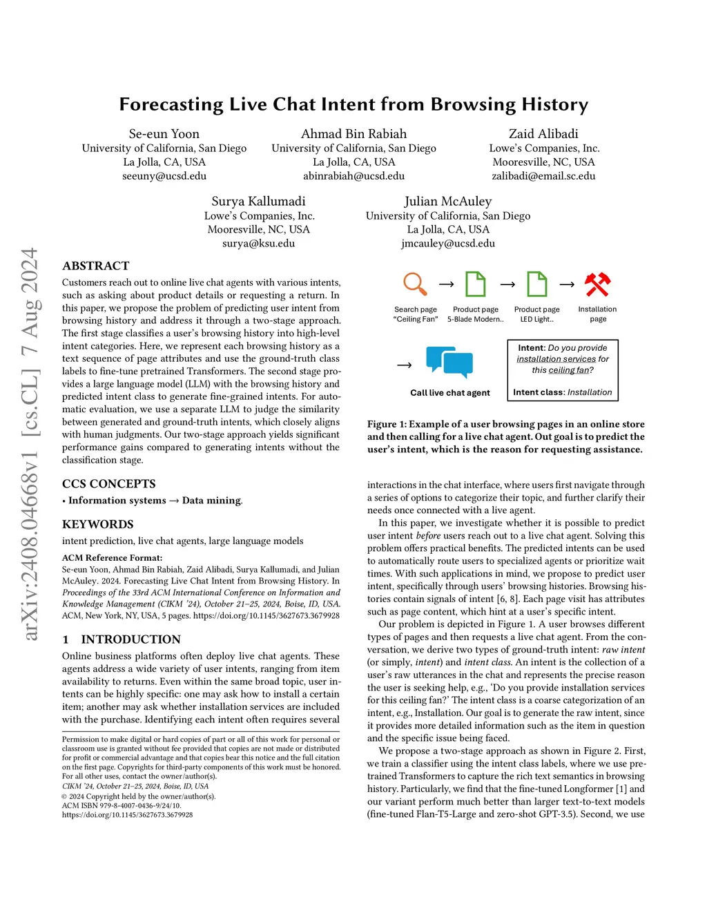 Customers reach out to online live chat agents with various intents, such as asking about product details or requesting a return. In this paper, we propose the problem of predicting user intent from browsing history and address it through a two-stage approach. The first stage classifies a user's browsing history into high-level intent categories. Here, we represent each browsing history as a text sequence of page attributes and use the ground-truth class labels to fine-tune pretrained Transformers. The second stage provides a large language model (LLM) with the browsing history and predicted intent class to generate fine-grained intents. For automatic evaluation, we use a separate LLM to judge the similarity between generated and ground-truth intents, which closely aligns with human judgments. Our two-stage approach yields significant performance gains compared to generating intents without the classification stage.