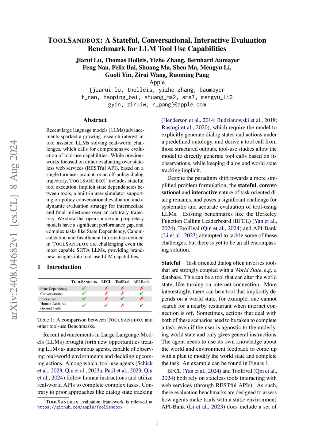 ToolSandbox: A Stateful, Conversational, Interactive Evaluation Benchmark for LLM Tool Use Capabilities