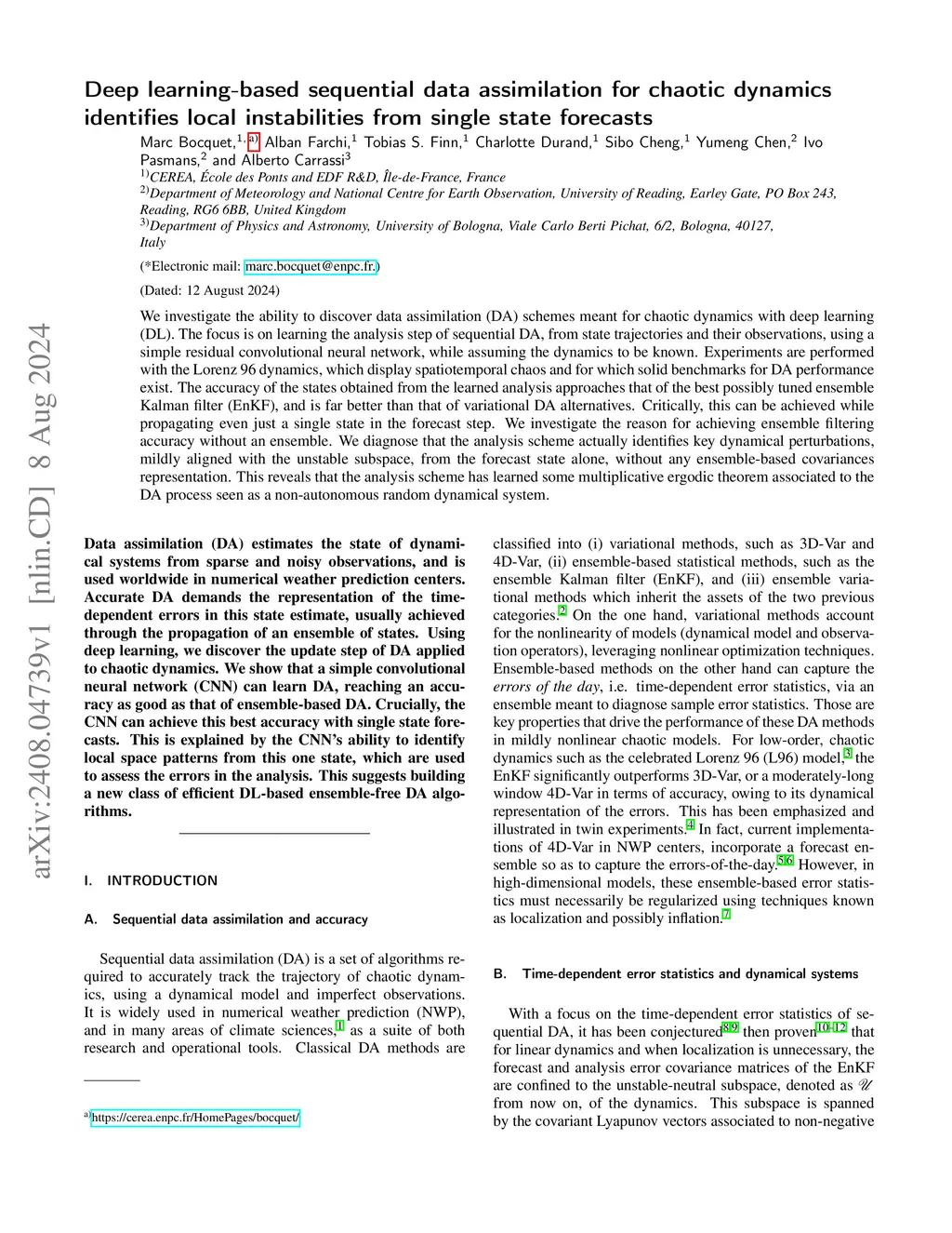 We investigate the ability to discover data assimilation (DA) schemes meant for chaotic dynamics with deep learning. The focus is on learning the analysis step of sequential DA, from state trajectories and their observations, using a simple residual convolutional neural network, while assuming the dynamics to be known. Experiments are performed with the Lorenz 96 dynamics, which display spatiotemporal chaos and for which solid benchmarks for DA performance exist. The accuracy of the states obtained from the learned analysis approaches that of the best possibly tuned ensemble Kalman filter, and is far better than that of variational DA alternatives. Critically, this can be achieved while propagating even just a single state in the forecast step. We investigate the reason for achieving ensemble filtering accuracy without an ensemble. We diagnose that the analysis scheme actually identifies key dynamical perturbations, mildly aligned with the unstable subspace, from the forecast state alone, without any ensemble-based covariances representation. This reveals that the analysis scheme has learned some multiplicative ergodic theorem associated to the DA process seen as a non-autonomous random dynamical system.