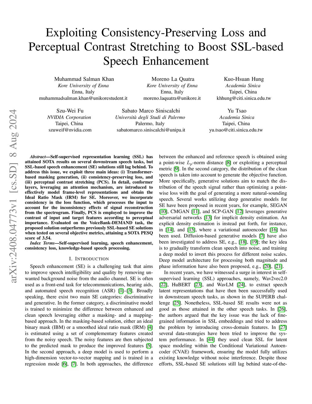 Self-supervised representation learning (SSL) has attained SOTA results on several downstream speech tasks, but SSL-based speech enhancement (SE) solutions still lag behind. To address this issue, we exploit three main ideas: (i) Transformer-based masking generation, (ii) consistency-preserving loss, and (iii) perceptual contrast stretching (PCS). In detail, conformer layers, leveraging an attention mechanism, are introduced to effectively model frame-level representations and obtain the Ideal Ratio Mask (IRM) for SE. Moreover, we incorporate consistency in the loss function, which processes the input to account for the inconsistency effects of signal reconstruction from the spectrogram. Finally, PCS is employed to improve the contrast of input and target features according to perceptual importance. Evaluated on the VoiceBank-DEMAND task, the proposed solution outperforms previously SSL-based SE solutions when tested on several objective metrics, attaining a SOTA PESQ score of 3.54.