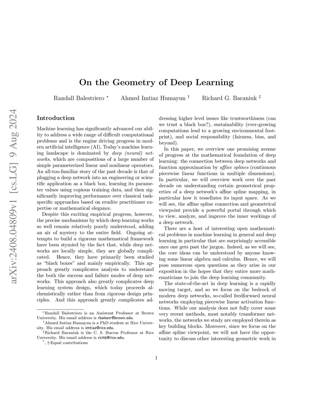 In this paper, we overview one promising avenue of progress at the mathematical foundation of deep learning: the connection between deep networks and function approximation by affine splines (continuous piecewise linear functions in multiple dimensions). In particular, we will overview work over the past decade on understanding certain geometrical properties of a deep network's affine spline mapping, in particular how it tessellates its input space. As we will see, the affine spline connection and geometrical viewpoint provide a powerful portal through which to view, analyze, and improve the inner workings of a deep network.
