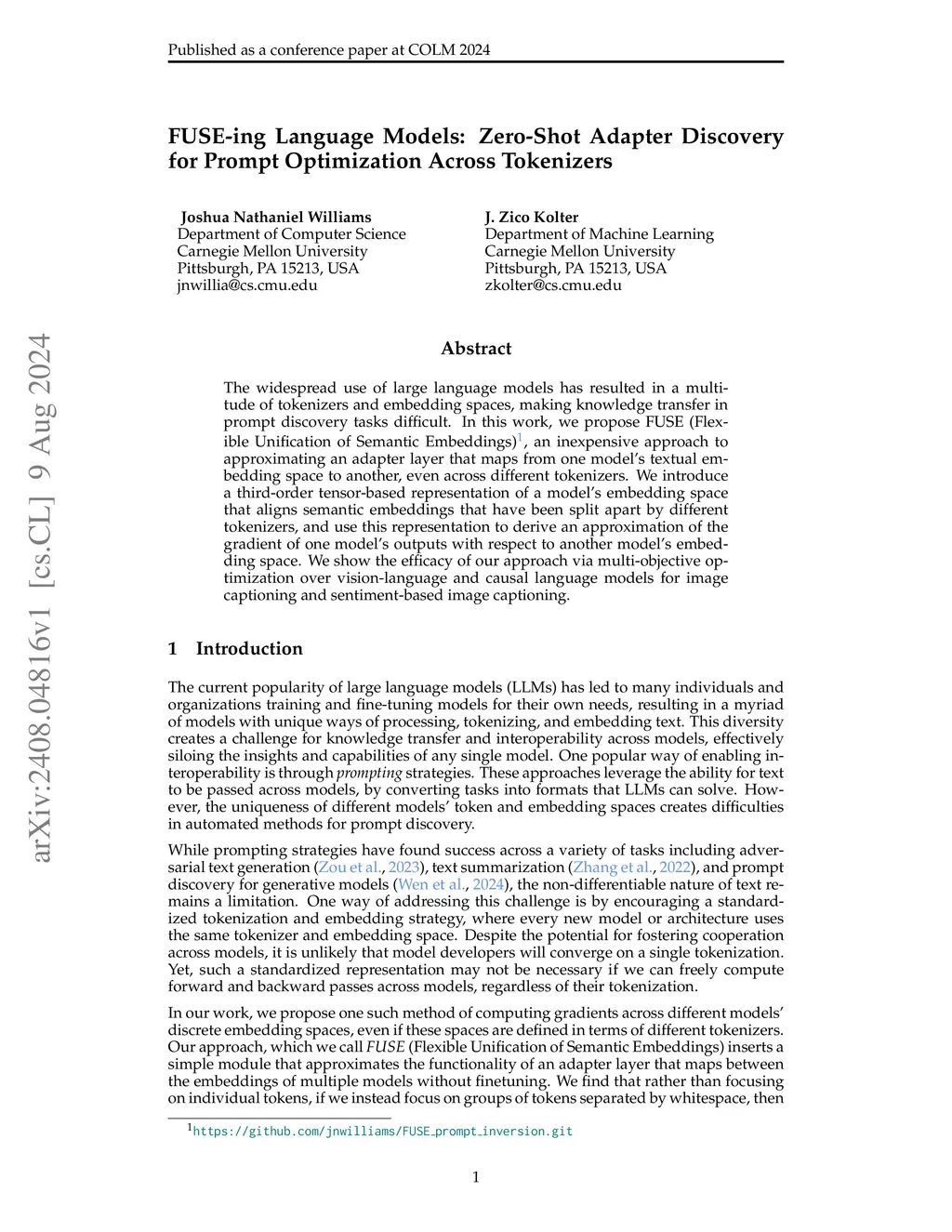 The widespread use of large language models has resulted in a multitude of tokenizers and embedding spaces, making knowledge transfer in prompt discovery tasks difficult. In this work, we propose FUSE (Flexible Unification of Semantic Embeddings), an inexpensive approach to approximating an adapter layer that maps from one model's textual embedding space to another, even across different tokenizers. We introduce a third-order tensor-based representation of a model's embedding space that aligns semantic embeddings that have been split apart by different tokenizers, and use this representation to derive an approximation of the gradient of one model's outputs with respect to another model's embedding space. We show the efficacy of our approach via multi-objective optimization over vision-language and causal language models for image captioning and sentiment-based image captioning.