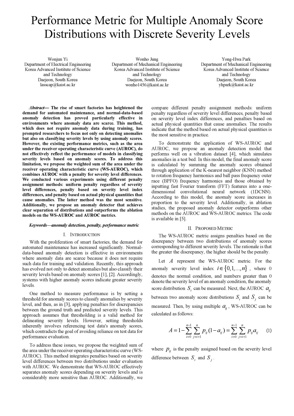 The rise of smart factories has heightened the demand for automated maintenance, and normal-data-based anomaly detection has proved particularly effective in environments where anomaly data are scarce. This method, which does not require anomaly data during training, has prompted researchers to focus not only on detecting anomalies but also on classifying severity levels by using anomaly scores. However, the existing performance metrics, such as the area under the receiver operating characteristic curve (AUROC), do not effectively reflect the performance of models in classifying severity levels based on anomaly scores. To address this limitation, we propose the weighted sum of the area under the receiver operating characteristic curve (WS-AUROC), which combines AUROC with a penalty for severity level differences. We conducted various experiments using different penalty assignment methods: uniform penalty regardless of severity level differences, penalty based on severity level index differences, and penalty based on actual physical quantities that cause anomalies. The latter method was the most sensitive. Additionally, we propose an anomaly detector that achieves clear separation of distributions and outperforms the ablation models on the WS-AUROC and AUROC metrics.