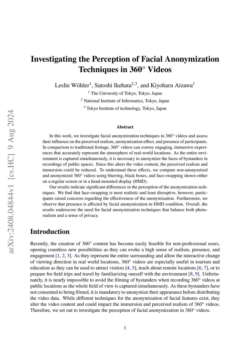 In this work, we investigate facial anonymization techniques in 360{\deg} videos and assess their influence on the perceived realism, anonymization effect, and presence of participants. In comparison to traditional footage, 360{\deg} videos can convey engaging, immersive experiences that accurately represent the atmosphere of real-world locations. As the entire environment is captured simultaneously, it is necessary to anonymize the faces of bystanders in recordings of public spaces. Since this alters the video content, the perceived realism and immersion could be reduced. To understand these effects, we compare non-anonymized and anonymized 360{\deg} videos using blurring, black boxes, and face-swapping shown either on a regular screen or in a head-mounted display (HMD). Our results indicate significant differences in the perception of the anonymization techniques. We find that face-swapping is most realistic and least disruptive, however, participants raised concerns regarding the effectiveness of the anonymization. Furthermore, we observe that presence is affected by facial anonymization in HMD condition. Overall, the results underscore the need for facial anonymization techniques that balance both photo-realism and a sense of privacy.