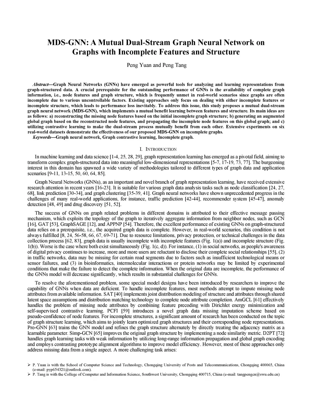 Graph Neural Networks (GNNs) have emerged as powerful tools for analyzing and learning representations from graph-structured data. A crucial prerequisite for the outstanding performance of GNNs is the availability of complete graph information, i.e., node features and graph structure, which is frequently unmet in real-world scenarios since graphs are often incomplete due to various uncontrollable factors. Existing approaches only focus on dealing with either incomplete features or incomplete structure, which leads to performance loss inevitably. To address this issue, this study proposes a mutual dual-stream graph neural network (MDS-GNN), which implements a mutual benefit learning between features and structure. Its main ideas are as follows: a) reconstructing the missing node features based on the initial incomplete graph structure; b) generating an augmented global graph based on the reconstructed node features, and propagating the incomplete node features on this global graph; and c) utilizing contrastive learning to make the dual-stream process mutually benefit from each other. Extensive experiments on six real-world datasets demonstrate the effectiveness of our proposed MDS-GNN on incomplete graphs.