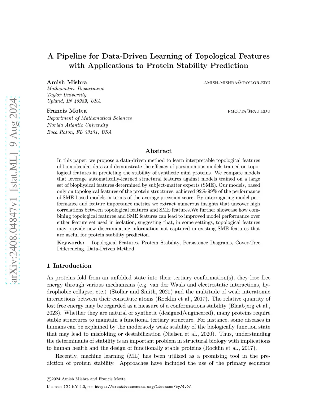 In this paper, we propose a data-driven method to learn interpretable topological features of biomolecular data and demonstrate the efficacy of parsimonious models trained on topological features in predicting the stability of synthetic mini proteins. We compare models that leverage automatically-learned structural features against models trained on a large set of biophysical features determined by subject-matter experts (SME). Our models, based only on topological features of the protein structures, achieved 92%-99% of the performance of SME-based models in terms of the average precision score. By interrogating model performance and feature importance metrics, we extract numerous insights that uncover high correlations between topological features and SME features. We further showcase how combining topological features and SME features can lead to improved model performance over either feature set used in isolation, suggesting that, in some settings, topological features may provide new discriminating information not captured in existing SME features that are useful for protein stability prediction.