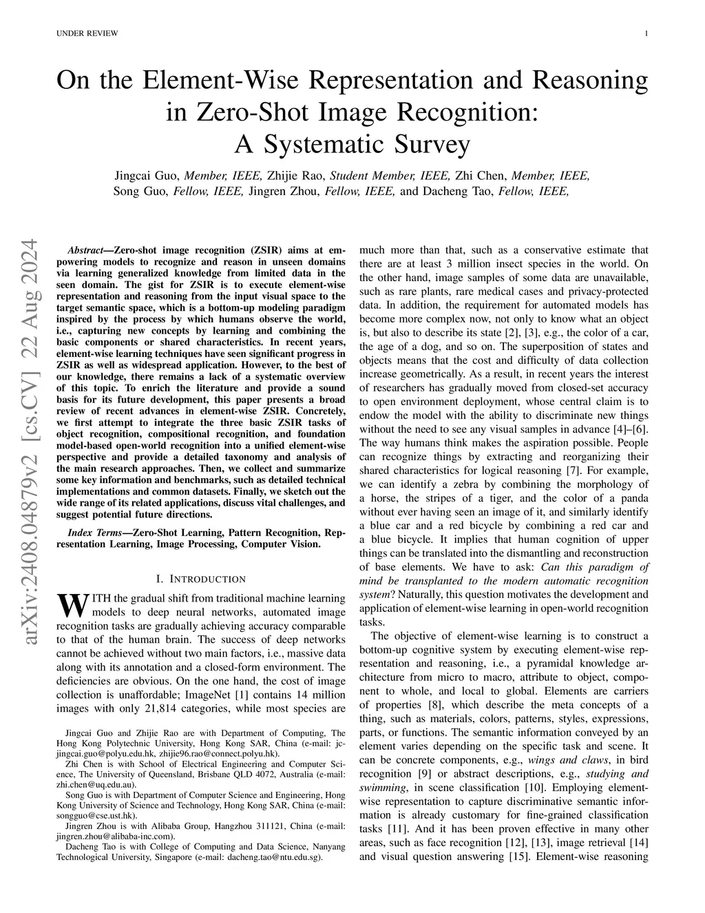 Zero-shot image recognition (ZSIR) aims at empowering models to recognize and reason in unseen domains via learning generalized knowledge from limited data in the seen domain. The gist for ZSIR is to execute element-wise representation and reasoning from the input visual space to the target semantic space, which is a bottom-up modeling paradigm inspired by the process by which humans observe the world, i.e., capturing new concepts by learning and combining the basic components or shared characteristics. In recent years, element-wise learning techniques have seen significant progress in ZSIR as well as widespread application. However, to the best of our knowledge, there remains a lack of a systematic overview of this topic. To enrich the literature and provide a sound basis for its future development, this paper presents a broad review of recent advances in element-wise ZSIR. Concretely, we first attempt to integrate the three basic ZSIR tasks of object recognition, compositional recognition, and foundation model-based open-world recognition into a unified element-wise perspective and provide a detailed taxonomy and analysis of the main research approaches. Then, we collect and summarize some key information and benchmarks, such as detailed technical implementations and common datasets. Finally, we sketch out the wide range of its related applications, discuss vital challenges, and suggest potential future directions.
