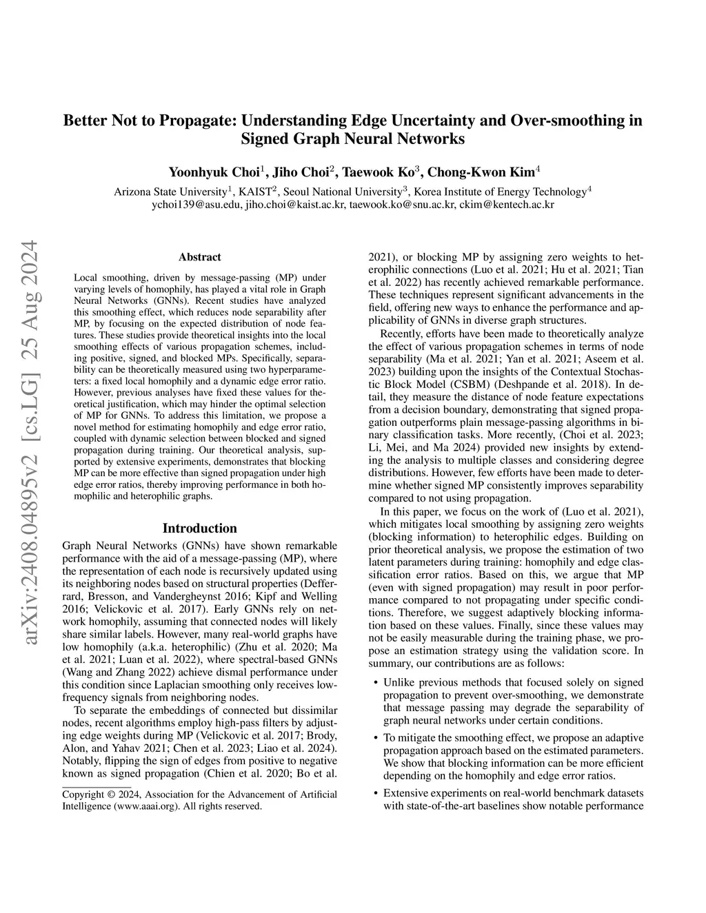 Traditional Graph Neural Networks (GNNs) rely on network homophily, which can lead to performance degradation due to over-smoothing in many real-world heterophily scenarios. Recent studies analyze the smoothing effect (separability) after message-passing (MP), depending on the expectation of node features. Regarding separability gain, they provided theoretical backgrounds on over-smoothing caused by various propagation schemes, including positive, signed, and blocked MPs. More recently, by extending these theorems, some works have suggested improvements in signed propagation under multiple classes. However, prior works assume that the error ratio of all propagation schemes is fixed, failing to investigate this phenomenon correctly. To solve this problem, we propose a novel method for estimating homophily and edge error ratio, integrated with dynamic selection between blocked and signed propagation during training. Our theoretical analysis, supported by extensive experiments, demonstrates that blocking MP can be more effective than signed propagation under high edge error ratios, improving the performance in both homophilic and heterophilic graphs.