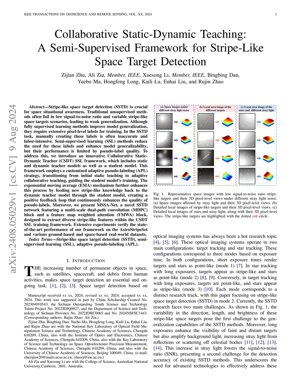 Stripe-like space target detection (SSTD) is crucial for space situational awareness. Traditional unsupervised methods often fail in low signal-to-noise ratio and variable stripe-like space targets scenarios, leading to weak generalization. Although fully supervised learning methods improve model generalization, they require extensive pixel-level labels for training. In the SSTD task, manually creating these labels is often inaccurate and labor-intensive. Semi-supervised learning (SSL) methods reduce the need for these labels and enhance model generalizability, but their performance is limited by pseudo-label quality. To address this, we introduce an innovative Collaborative Static-Dynamic Teacher (CSDT) SSL framework, which includes static and dynamic teacher models as well as a student model. This framework employs a customized adaptive pseudo-labeling (APL) strategy, transitioning from initial static teaching to adaptive collaborative teaching, guiding the student model's training. The exponential moving average (EMA) mechanism further enhances this process by feeding new stripe-like knowledge back to the dynamic teacher model through the student model, creating a positive feedback loop that continuously enhances the quality of pseudo-labels. Moreover, we present MSSA-Net, a novel SSTD network featuring a multi-scale dual-path convolution (MDPC) block and a feature map weighted attention (FMWA) block, designed to extract diverse stripe-like features within the CSDT SSL training framework. Extensive experiments verify the state-of-the-art performance of our framework on the AstroStripeSet and various ground-based and space-based real-world datasets.