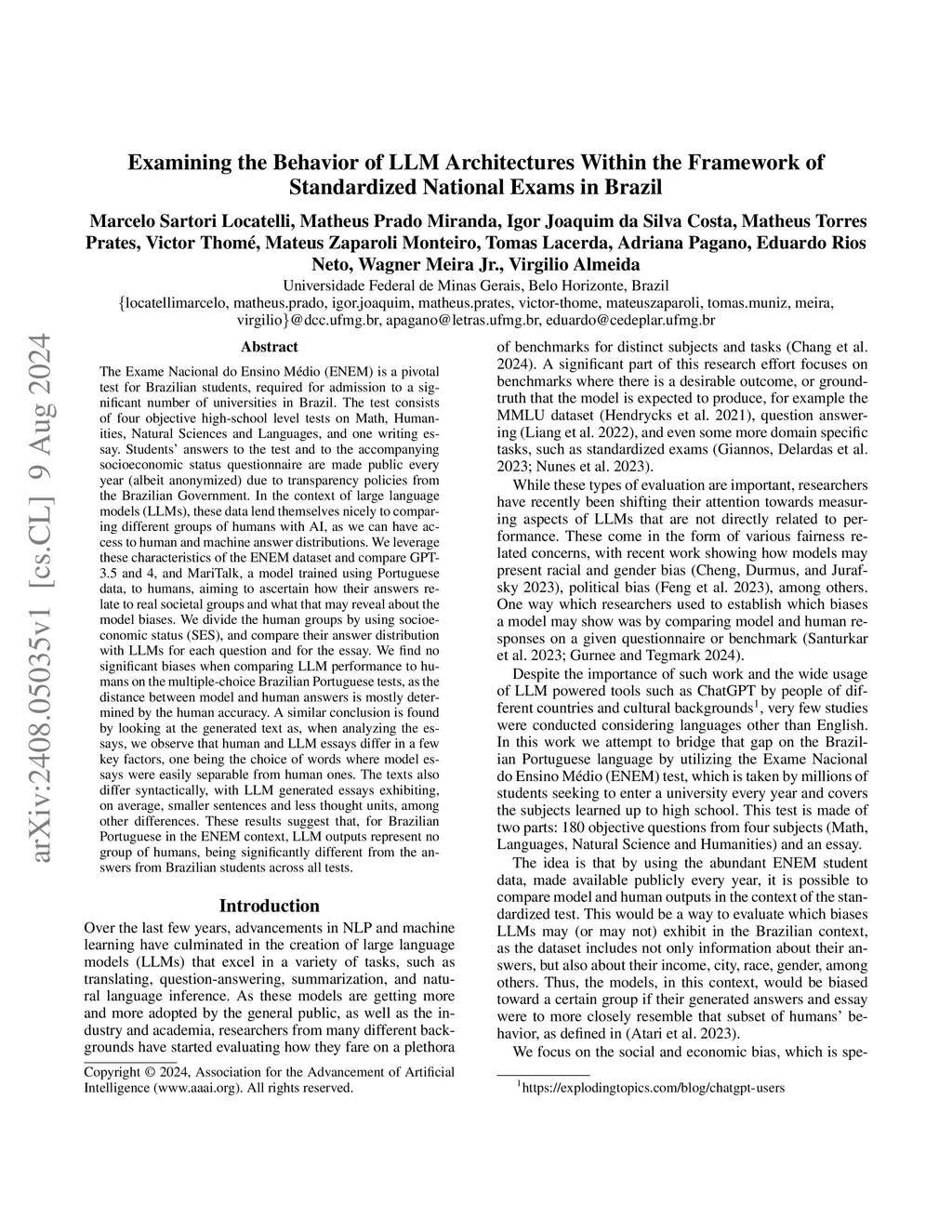 The Exame Nacional do Ensino M\édio (ENEM) is a pivotal test for Brazilian students, required for admission to a significant number of universities in Brazil. The test consists of four objective high-school level tests on Math, Humanities, Natural Sciences and Languages, and one writing essay. Students' answers to the test and to the accompanying socioeconomic status questionnaire are made public every year (albeit anonymized) due to transparency policies from the Brazilian Government. In the context of large language models (LLMs), these data lend themselves nicely to comparing different groups of humans with AI, as we can have access to human and machine answer distributions. We leverage these characteristics of the ENEM dataset and compare GPT-3.5 and 4, and MariTalk, a model trained using Portuguese data, to humans, aiming to ascertain how their answers relate to real societal groups and what that may reveal about the model biases. We divide the human groups by using socioeconomic status (SES), and compare their answer distribution with LLMs for each question and for the essay. We find no significant biases when comparing LLM performance to humans on the multiple-choice Brazilian Portuguese tests, as the distance between model and human answers is mostly determined by the human accuracy. A similar conclusion is found by looking at the generated text as, when analyzing the essays, we observe that human and LLM essays differ in a few key factors, one being the choice of words where model essays were easily separable from human ones. The texts also differ syntactically, with LLM generated essays exhibiting, on average, smaller sentences and less thought units, among other differences. These results suggest that, for Brazilian Portuguese in the ENEM context, LLM outputs represent no group of humans, being significantly different from the answers from Brazilian students across all tests.