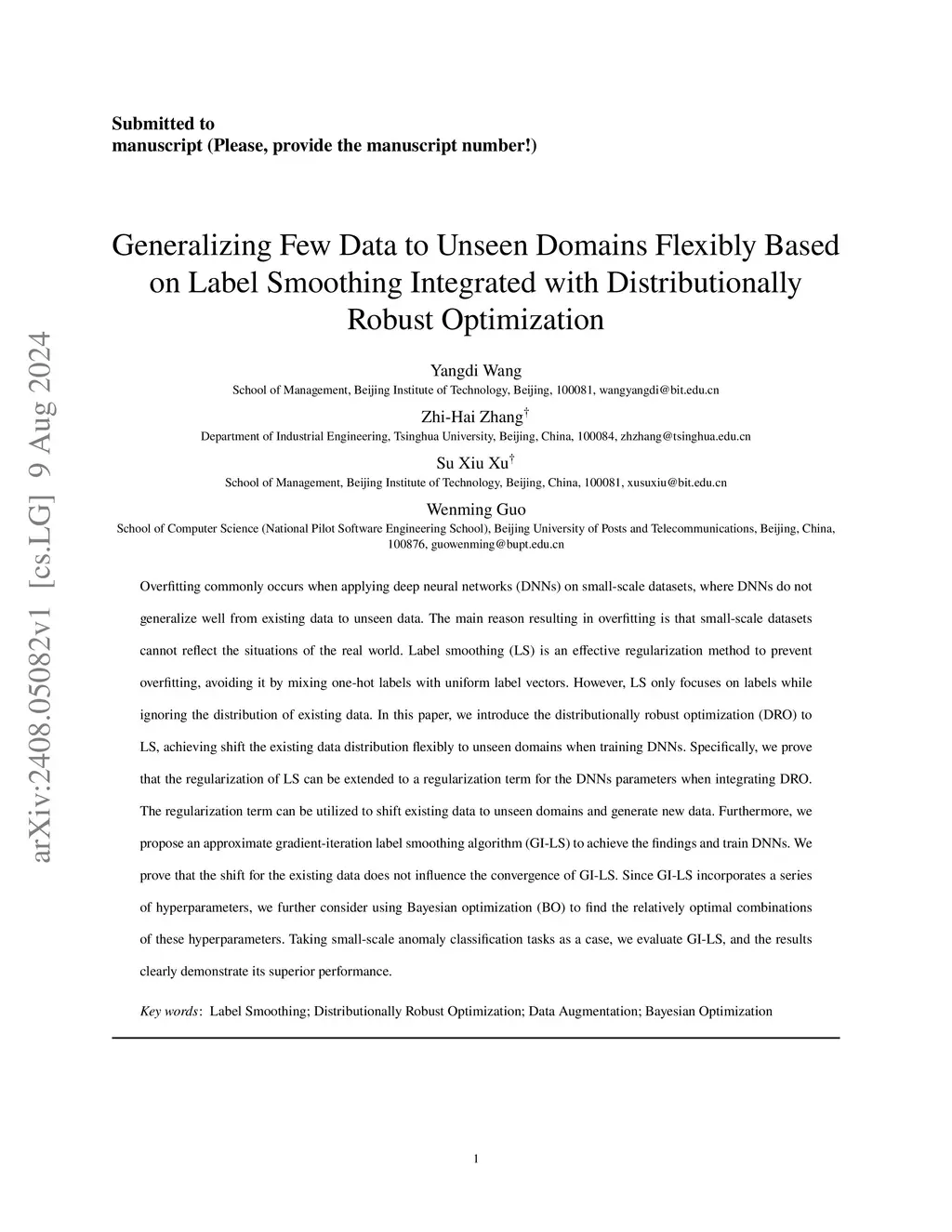 Overfitting commonly occurs when applying deep neural networks (DNNs) on small-scale datasets, where DNNs do not generalize well from existing data to unseen data. The main reason resulting in overfitting is that small-scale datasets cannot reflect the situations of the real world. Label smoothing (LS) is an effective regularization method to prevent overfitting, avoiding it by mixing one-hot labels with uniform label vectors. However, LS only focuses on labels while ignoring the distribution of existing data. In this paper, we introduce the distributionally robust optimization (DRO) to LS, achieving shift the existing data distribution flexibly to unseen domains when training DNNs. Specifically, we prove that the regularization of LS can be extended to a regularization term for the DNNs parameters when integrating DRO. The regularization term can be utilized to shift existing data to unseen domains and generate new data. Furthermore, we propose an approximate gradient-iteration label smoothing algorithm (GI-LS) to achieve the findings and train DNNs. We prove that the shift for the existing data does not influence the convergence of GI-LS. Since GI-LS incorporates a series of hyperparameters, we further consider using Bayesian optimization (BO) to find the relatively optimal combinations of these hyperparameters. Taking small-scale anomaly classification tasks as a case, we evaluate GI-LS, and the results clearly demonstrate its superior performance.