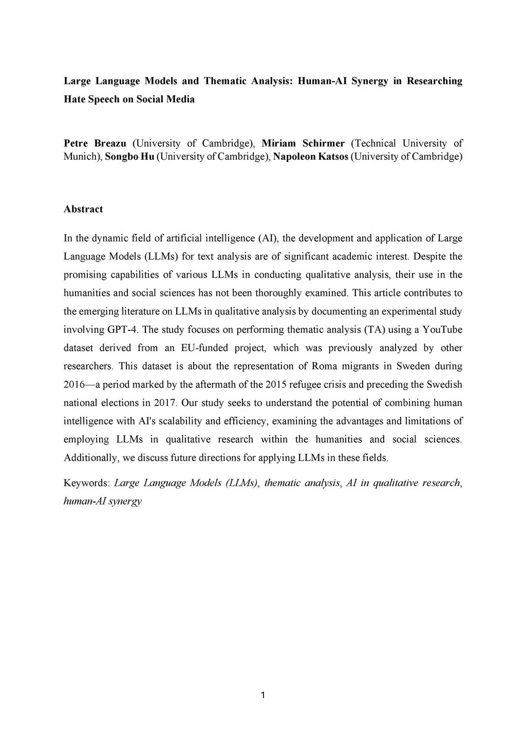 In the dynamic field of artificial intelligence (AI), the development and application of Large Language Models (LLMs) for text analysis are of significant academic interest. Despite the promising capabilities of various LLMs in conducting qualitative analysis, their use in the humanities and social sciences has not been thoroughly examined. This article contributes to the emerging literature on LLMs in qualitative analysis by documenting an experimental study involving GPT-4. The study focuses on performing thematic analysis (TA) using a YouTube dataset derived from an EU-funded project, which was previously analyzed by other researchers. This dataset is about the representation of Roma migrants in Sweden during 2016, a period marked by the aftermath of the 2015 refugee crisis and preceding the Swedish national elections in 2017. Our study seeks to understand the potential of combining human intelligence with AI's scalability and efficiency, examining the advantages and limitations of employing LLMs in qualitative research within the humanities and social sciences. Additionally, we discuss future directions for applying LLMs in these fields.