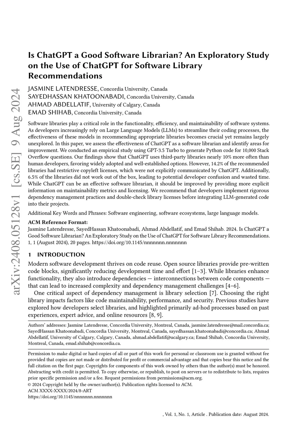 Software libraries play a critical role in the functionality, efficiency, and maintainability of software systems. As developers increasingly rely on Large Language Models (LLMs) to streamline their coding processes, the effectiveness of these models in recommending appropriate libraries becomes crucial yet remains largely unexplored. In this paper, we assess the effectiveness of ChatGPT as a software librarian and identify areas for improvement. We conducted an empirical study using GPT-3.5 Turbo to generate Python code for 10,000 Stack Overflow questions. Our findings show that ChatGPT uses third-party libraries nearly 10% more often than human developers, favoring widely adopted and well-established options. However, 14.2% of the recommended libraries had restrictive copyleft licenses, which were not explicitly communicated by ChatGPT. Additionally, 6.5% of the libraries did not work out of the box, leading to potential developer confusion and wasted time. While ChatGPT can be an effective software librarian, it should be improved by providing more explicit information on maintainability metrics and licensing. We recommend that developers implement rigorous dependency management practices and double-check library licenses before integrating LLM-generated code into their projects.