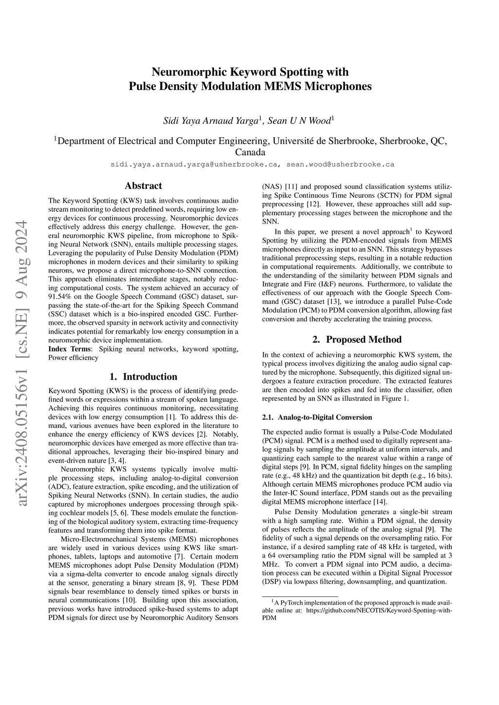 The Keyword Spotting (KWS) task involves continuous audio stream monitoring to detect predefined words, requiring low energy devices for continuous processing. Neuromorphic devices effectively address this energy challenge. However, the general neuromorphic KWS pipeline, from microphone to Spiking Neural Network (SNN), entails multiple processing stages. Leveraging the popularity of Pulse Density Modulation (PDM) microphones in modern devices and their similarity to spiking neurons, we propose a direct microphone-to-SNN connection. This approach eliminates intermediate stages, notably reducing computational costs. The system achieved an accuracy of 91.54\% on the Google Speech Command (GSC) dataset, surpassing the state-of-the-art for the Spiking Speech Command (SSC) dataset which is a bio-inspired encoded GSC. Furthermore, the observed sparsity in network activity and connectivity indicates potential for remarkably low energy consumption in a neuromorphic device implementation.