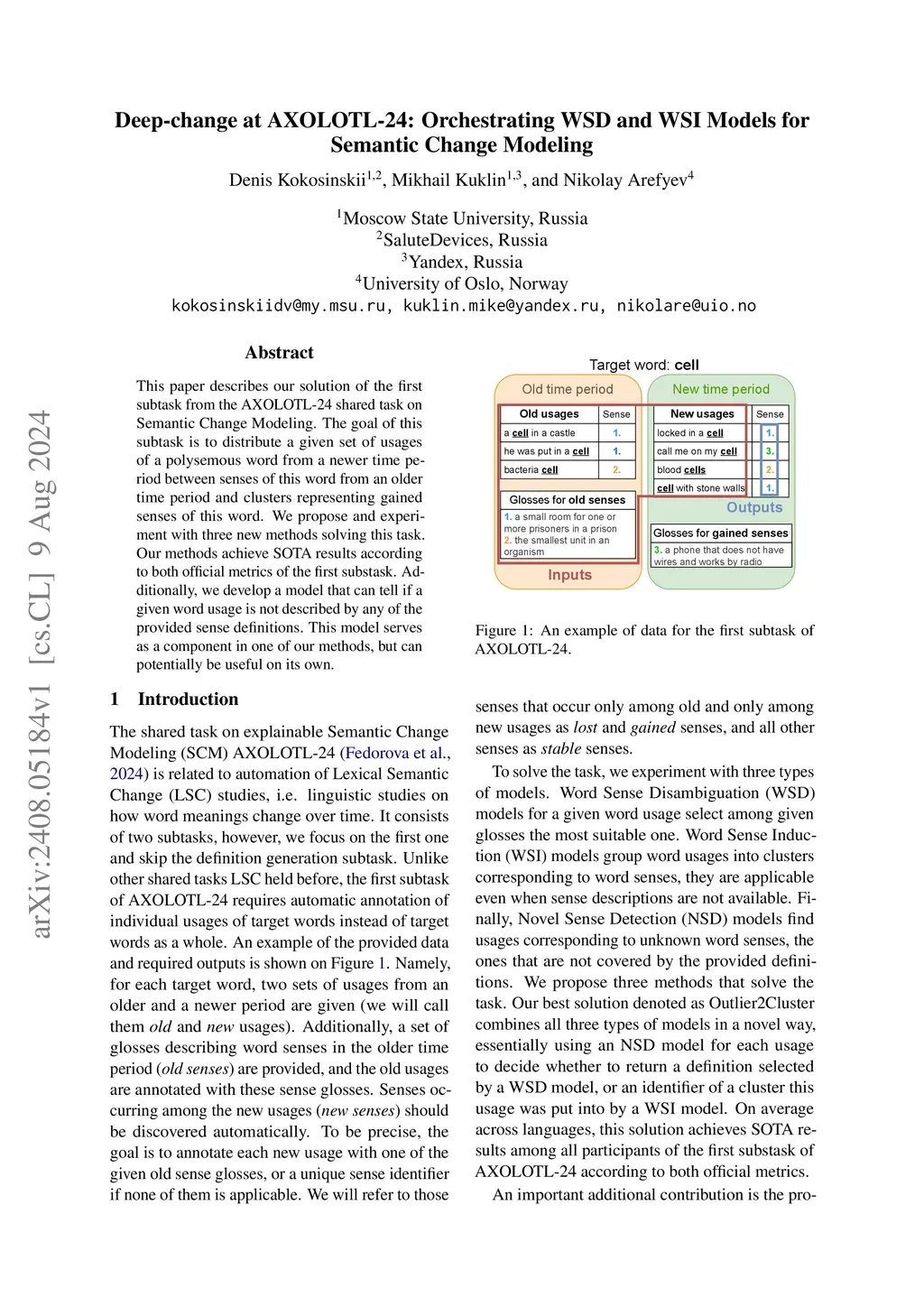 This paper describes our solution of the first subtask from the AXOLOTL-24 shared task on Semantic Change Modeling. The goal of this subtask is to distribute a given set of usages of a polysemous word from a newer time period between senses of this word from an older time period and clusters representing gained senses of this word. We propose and experiment with three new methods solving this task. Our methods achieve SOTA results according to both official metrics of the first substask. Additionally, we develop a model that can tell if a given word usage is not described by any of the provided sense definitions. This model serves as a component in one of our methods, but can potentially be useful on its own.