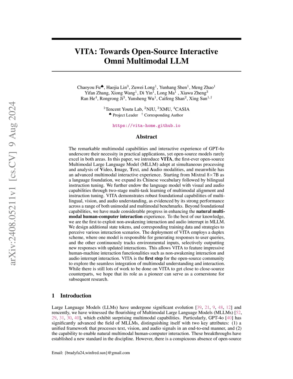 The remarkable multimodal capabilities and interactive experience of GPT-4o underscore their necessity in practical applications, yet open-source models rarely excel in both areas. In this paper, we introduce VITA, the first-ever open-source Multimodal Large Language Model (MLLM) adept at simultaneous processing and analysis of Video, Image, Text, and Audio modalities, and meanwhile has an advanced multimodal interactive experience. Starting from Mixtral 8x7B as a language foundation, we expand its Chinese vocabulary followed by bilingual instruction tuning. We further endow the language model with visual and audio capabilities through two-stage multi-task learning of multimodal alignment and instruction tuning. VITA demonstrates robust foundational capabilities of multilingual, vision, and audio understanding, as evidenced by its strong performance across a range of both unimodal and multimodal benchmarks. Beyond foundational capabilities, we have made considerable progress in enhancing the natural multimodal human-computer interaction experience. VITA is the first step for the open-source community to explore the seamless integration of multimodal understanding and interaction. While there is still lots of work to be done on VITA to get close to close-source counterparts, we hope that its role as a pioneer can serve as a cornerstone for subsequent research. Project Page:this https URL.