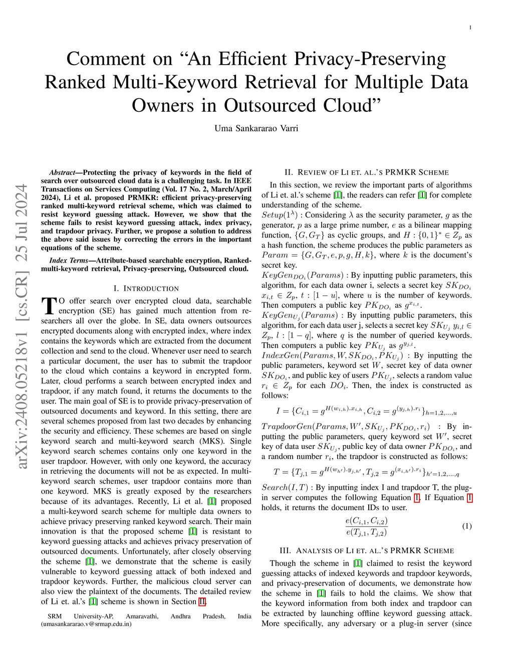 Comment on "An Efficient Privacy-Preserving Ranked Multi-Keyword