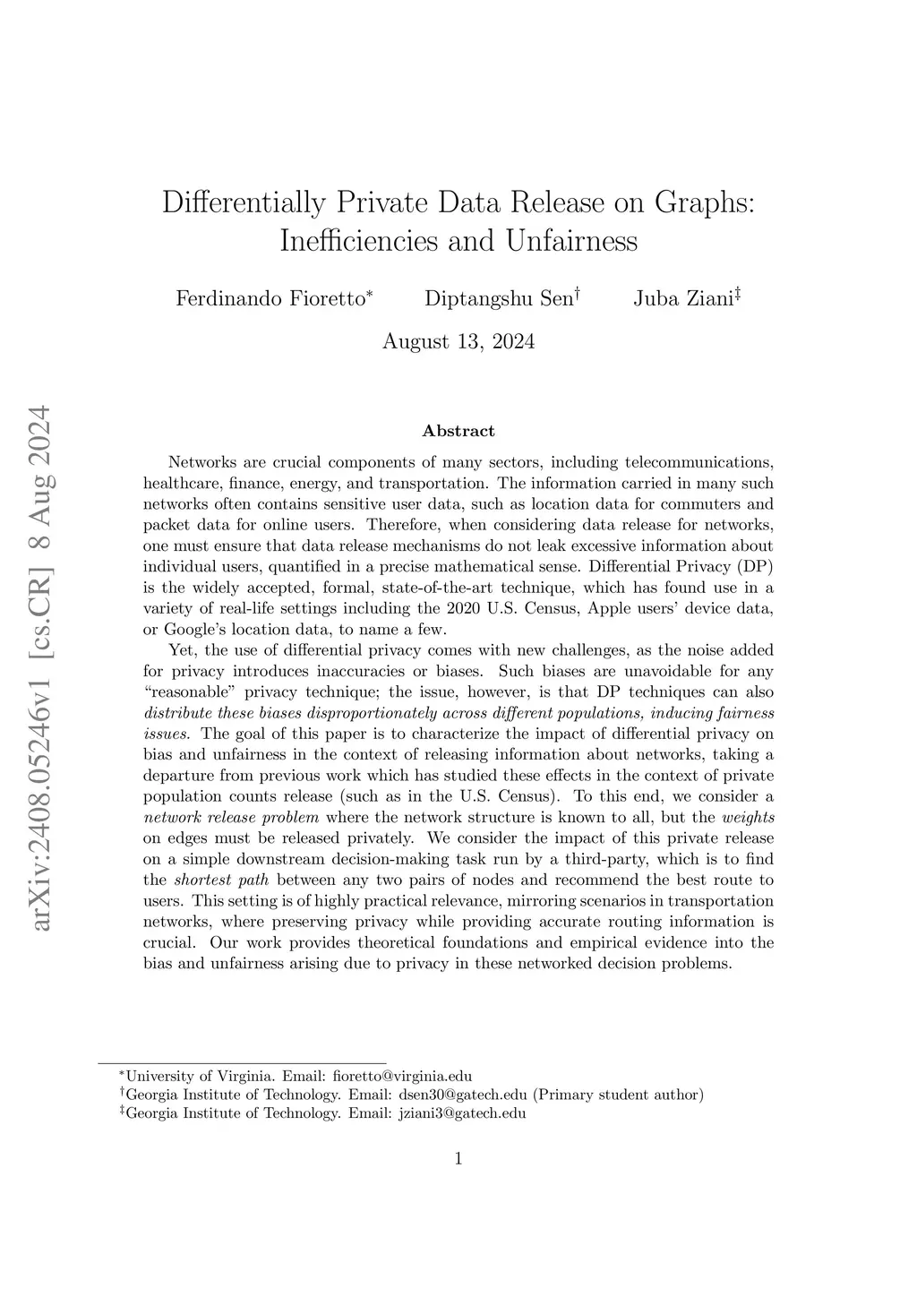 Networks are crucial components of many sectors, including telecommunications, healthcare, finance, energy, and transportation.The information carried in such networks often contains sensitive user data, like location data for commuters and packet data for online users. Therefore, when considering data release for networks, one must ensure that data release mechanisms do not leak information about individuals, quantified in a precise mathematical sense. Differential Privacy (DP) is the widely accepted, formal, state-of-the-art technique, which has found use in a variety of real-life settings including the 2020 U.S. Census, Apple users' device data, or Google's location data. Yet, the use of DP comes with new challenges, as the noise added for privacy introduces inaccuracies or biases and further, DP techniques can also distribute these biases disproportionately across different populations, inducing fairness issues. The goal of this paper is to characterize the impact of DP on bias and unfairness in the context of releasing information about networks, taking a departure from previous work which has studied these effects in the context of private population counts release (such as in the U.S. Census). To this end, we consider a network release problem where the network structure is known to all, but the weights on edges must be released privately. We consider the impact of this private release on a simple downstream decision-making task run by a third-party, which is to find the shortest path between any two pairs of nodes and recommend the best route to users. This setting is of highly practical relevance, mirroring scenarios in transportation networks, where preserving privacy while providing accurate routing information is crucial. Our work provides theoretical foundations and empirical evidence into the bias and unfairness arising due to privacy in these networked decision problems.
