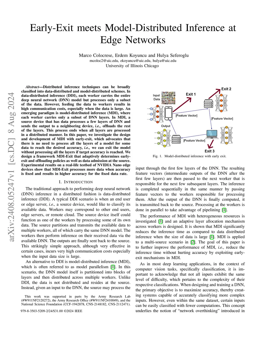 Distributed inference techniques can be broadly classified into data-distributed and model-distributed schemes. In data-distributed inference (DDI), each worker carries the entire deep neural network (DNN) model but processes only a subset of the data. However, feeding the data to workers results in high communication costs, especially when the data is large. An emerging paradigm is model-distributed inference (MDI), where each worker carries only a subset of DNN layers. In MDI, a source device that has data processes a few layers of DNN and sends the output to a neighboring device, i.e., offloads the rest of the layers. This process ends when all layers are processed in a distributed manner. In this paper, we investigate the design and development of MDI with early-exit, which advocates that there is no need to process all the layers of a model for some data to reach the desired accuracy, i.e., we can exit the model without processing all the layers if target accuracy is reached. We design a framework MDI-Exit that adaptively determines early-exit and offloading policies as well as data admission at the source. Experimental results on a real-life testbed of NVIDIA Nano edge devices show that MDI-Exit processes more data when accuracy is fixed and results in higher accuracy for the fixed data rate.