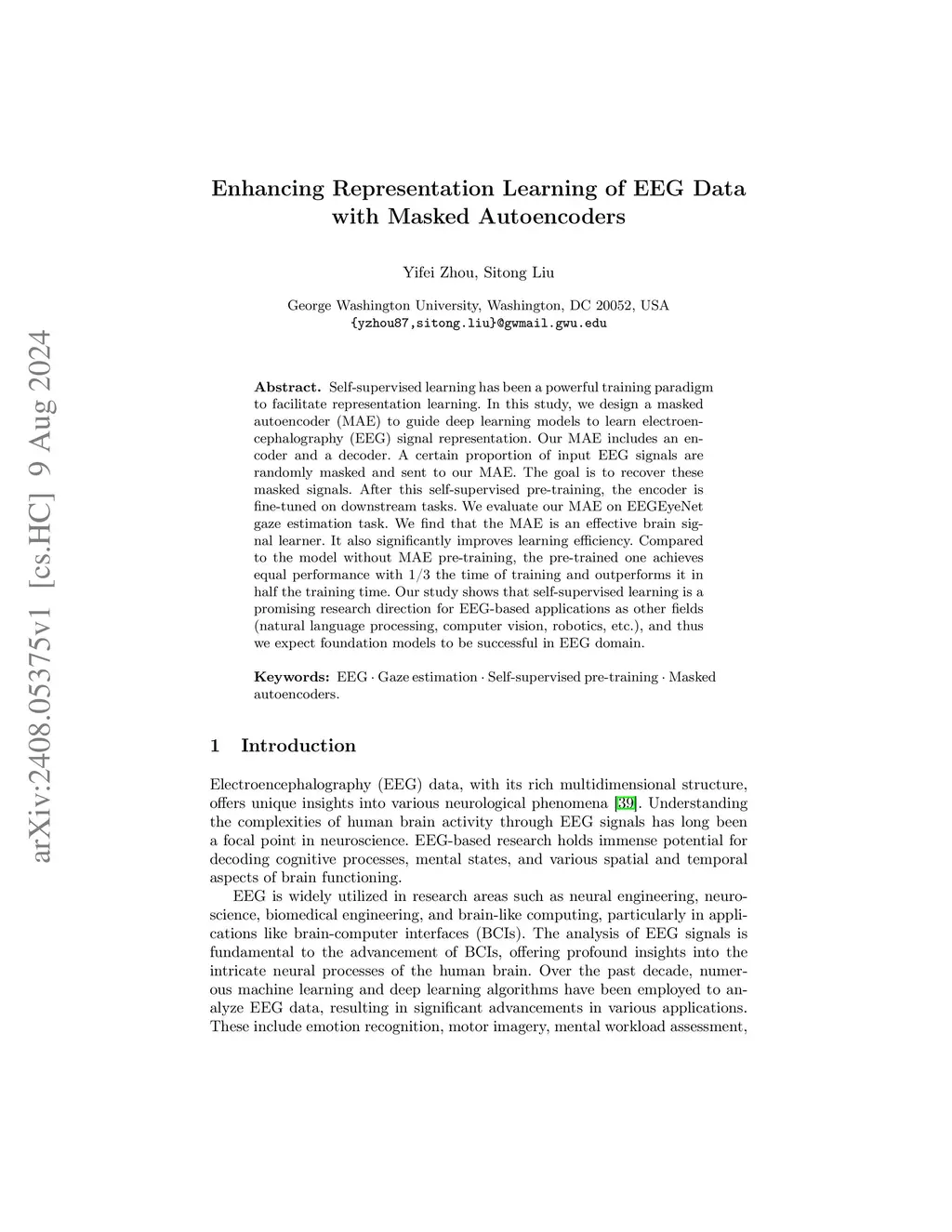 Self-supervised learning has been a powerful training paradigm to facilitate representation learning. In this study, we design a masked autoencoder (MAE) to guide deep learning models to learn electroencephalography (EEG) signal representation. Our MAE includes an encoder and a decoder. A certain proportion of input EEG signals are randomly masked and sent to our MAE. The goal is to recover these masked signals. After this self-supervised pre-training, the encoder is fine-tuned on downstream tasks. We evaluate our MAE on EEGEyeNet gaze estimation task. We find that the MAE is an effective brain signal learner. It also significantly improves learning efficiency. Compared to the model without MAE pre-training, the pre-trained one achieves equal performance with 1/3 the time of training and outperforms it in half the training time. Our study shows that self-supervised learning is a promising research direction for EEG-based applications as other fields (natural language processing, computer vision, robotics, etc.), and thus we expect foundation models to be successful in EEG domain.