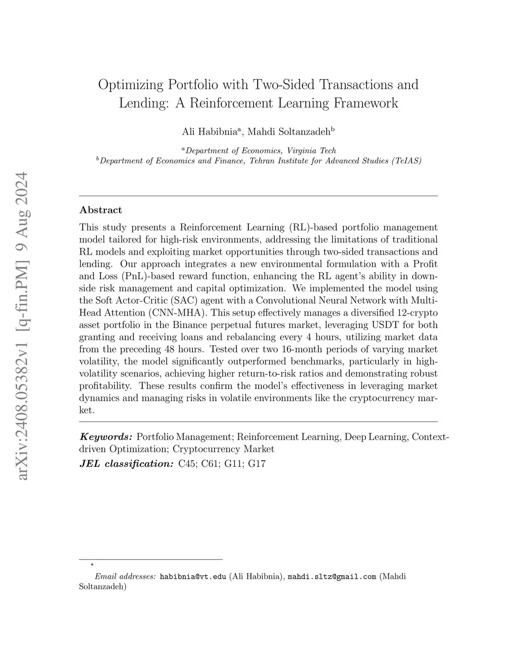 This study presents a Reinforcement Learning (RL)-based portfolio management model tailored for high-risk environments, addressing the limitations of traditional RL models and exploiting market opportunities through two-sided transactions and lending. Our approach integrates a new environmental formulation with a Profit and Loss (PnL)-based reward function, enhancing the RL agent's ability in downside risk management and capital optimization. We implemented the model using the Soft Actor-Critic (SAC) agent with a Convolutional Neural Network with Multi-Head Attention (CNN-MHA). This setup effectively manages a diversified 12-crypto asset portfolio in the Binance perpetual futures market, leveraging USDT for both granting and receiving loans and rebalancing every 4 hours, utilizing market data from the preceding 48 hours. Tested over two 16-month periods of varying market volatility, the model significantly outperformed benchmarks, particularly in high-volatility scenarios, achieving higher return-to-risk ratios and demonstrating robust profitability. These results confirm the model's effectiveness in leveraging market dynamics and managing risks in volatile environments like the cryptocurrency market.