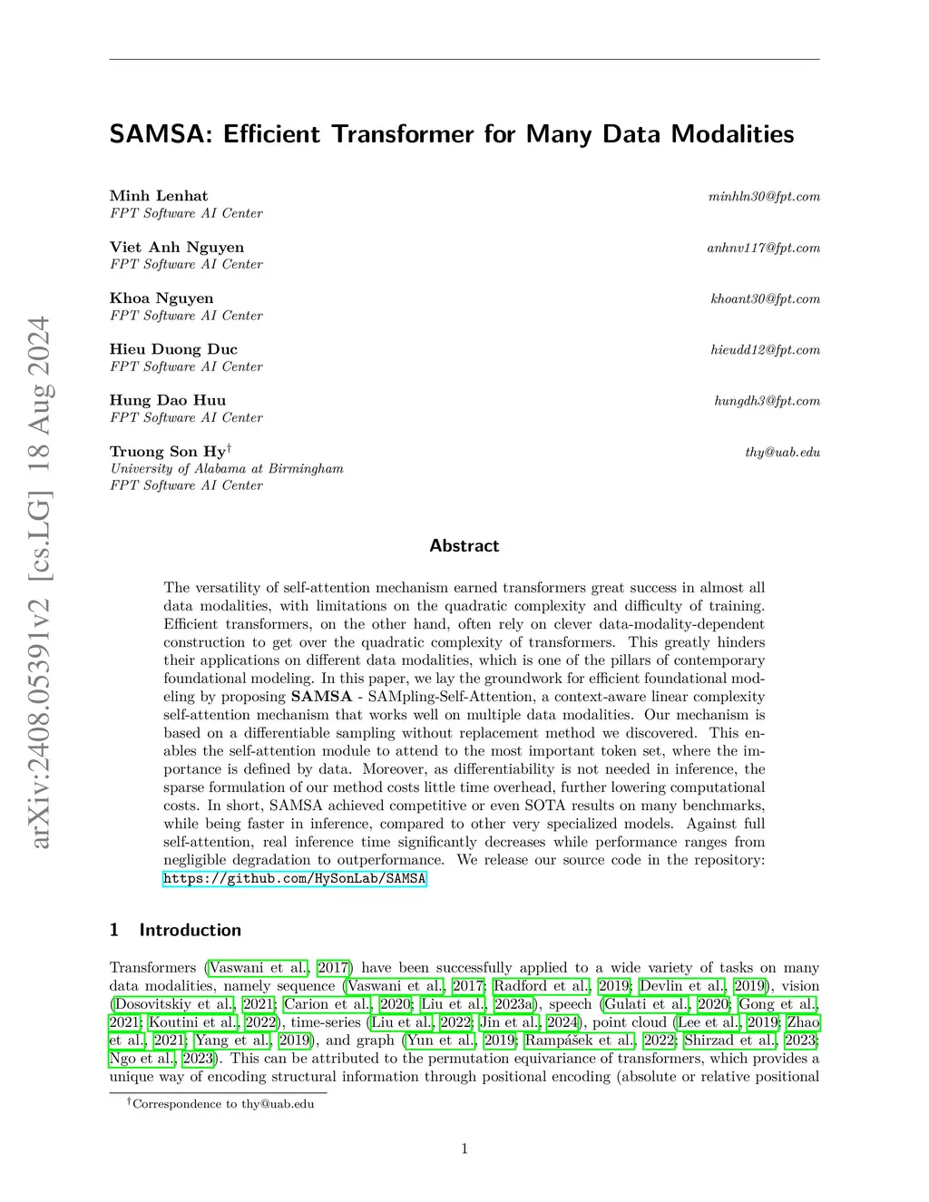 The versatility of self-attention mechanism earned transformers great success in almost all data modalities, with limitations on the quadratic complexity and difficulty of training. Efficient transformers, on the other hand, often rely on clever data-modality-dependent construction to get over the quadratic complexity of transformers. This greatly hinders their applications on different data modalities, which is one of the pillars of contemporary foundational modeling. In this paper, we lay the groundwork for efficient foundational modeling by proposing SAMSA - SAMpling-Self-Attention, a context-aware linear complexity self-attention mechanism that works well on multiple data modalities. Our mechanism is based on a differentiable sampling without replacement method we discovered. This enables the self-attention module to attend to the most important token set, where the importance is defined by data. Moreover, as differentiability is not needed in inference, the sparse formulation of our method costs little time overhead, further lowering computational costs. In short, SAMSA achieved competitive or even SOTA results on many benchmarks, while being faster in inference, compared to other very specialized models. Against full self-attention, real inference time significantly decreases while performance ranges from negligible degradation to outperformance. We release our source code in the repository: https://github.com/HySonLab/SAMSA