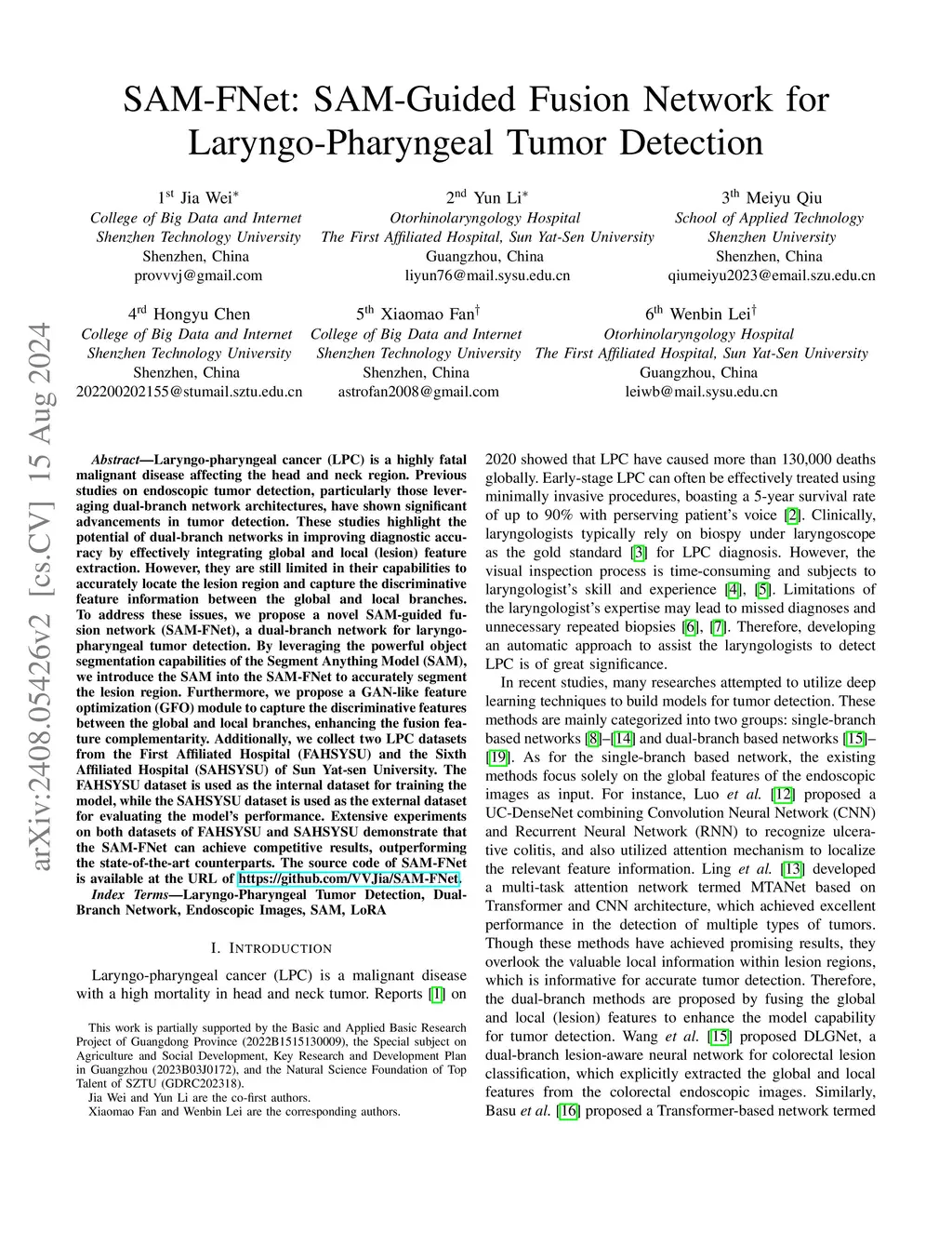 SAM-FNet: SAM-Guided Fusion Network for Laryngo-Pharyngeal Tumor