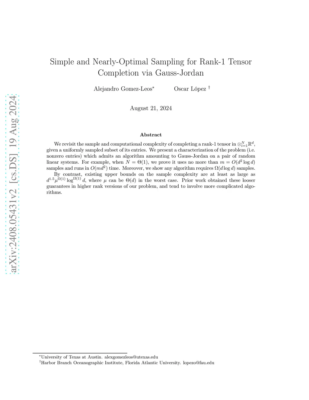 We revisit the sample and computational complexity of completing a rank-1 tensor in , given a uniformly sampled subset of its entries. We present a characterization of the problem (i.e. nonzero entries) which admits an algorithm amounting to Gauss-Jordan on a pair of random linear systems. For example, when , we prove it uses no more than samples and runs in time. Moreover, we show any algorithm requires samples. By contrast, existing upper bounds on the sample complexity are at least as large as , where can be in the worst case. Prior work obtained these looser guarantees in higher rank versions of our problem, and tend to involve more complicated algorithms.