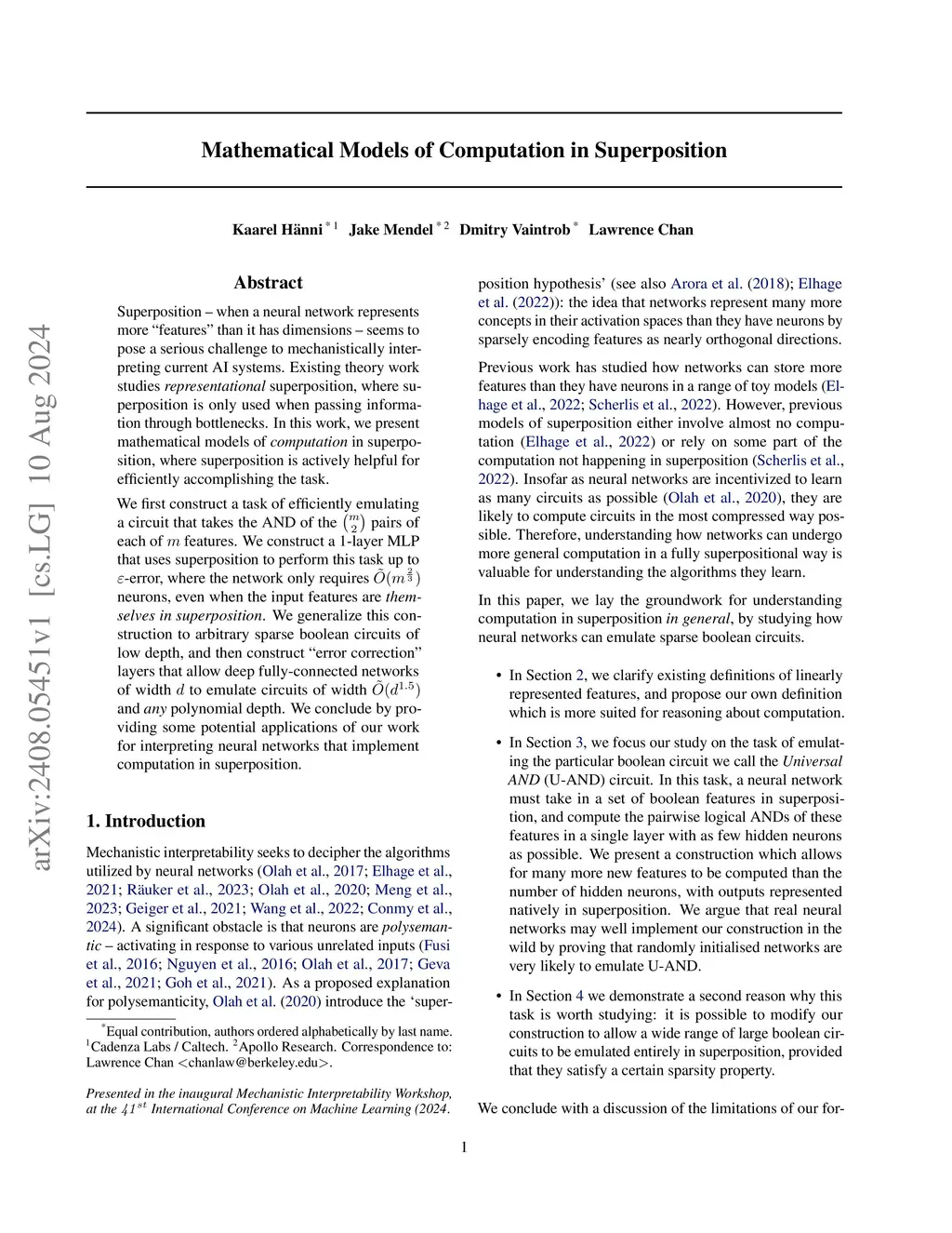 Superposition -- when a neural network represents more ``features'' than it has dimensions -- seems to pose a serious challenge to mechanistically interpreting current AI systems. Existing theory work studies \emph{representational} superposition, where superposition is only used when passing information through bottlenecks. In this work, we present mathematical models of \emph{computation} in superposition, where superposition is actively helpful for efficiently accomplishing the task. We first construct a task of efficiently emulating a circuit that takes the AND of the pairs of each of features. We construct a 1-layer MLP that uses superposition to perform this task up to -error, where the network only requires neurons, even when the input features are \emph{themselves in superposition}. We generalize this construction to arbitrary sparse boolean circuits of low depth, and then construct ``error correction'' layers that allow deep fully-connected networks of width to emulate circuits of width and \emph{any} polynomial depth. We conclude by providing some potential applications of our work for interpreting neural networks that implement computation in superposition.