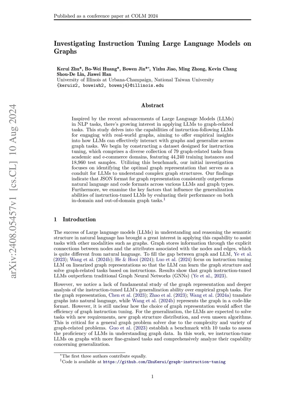 Inspired by the recent advancements of Large Language Models (LLMs) in NLP tasks, there's growing interest in applying LLMs to graph-related tasks. This study delves into the capabilities of instruction-following LLMs for engaging with real-world graphs, aiming to offer empirical insights into how LLMs can effectively interact with graphs and generalize across graph tasks. We begin by constructing a dataset designed for instruction tuning, which comprises a diverse collection of 79 graph-related tasks from academic and e-commerce domains, featuring 44,240 training instances and 18,960 test samples. Utilizing this benchmark, our initial investigation focuses on identifying the optimal graph representation that serves as a conduit for LLMs to understand complex graph structures. Our findings indicate that JSON format for graph representation consistently outperforms natural language and code formats across various LLMs and graph types. Furthermore, we examine the key factors that influence the generalization abilities of instruction-tuned LLMs by evaluating their performance on both in-domain and out-of-domain graph tasks.